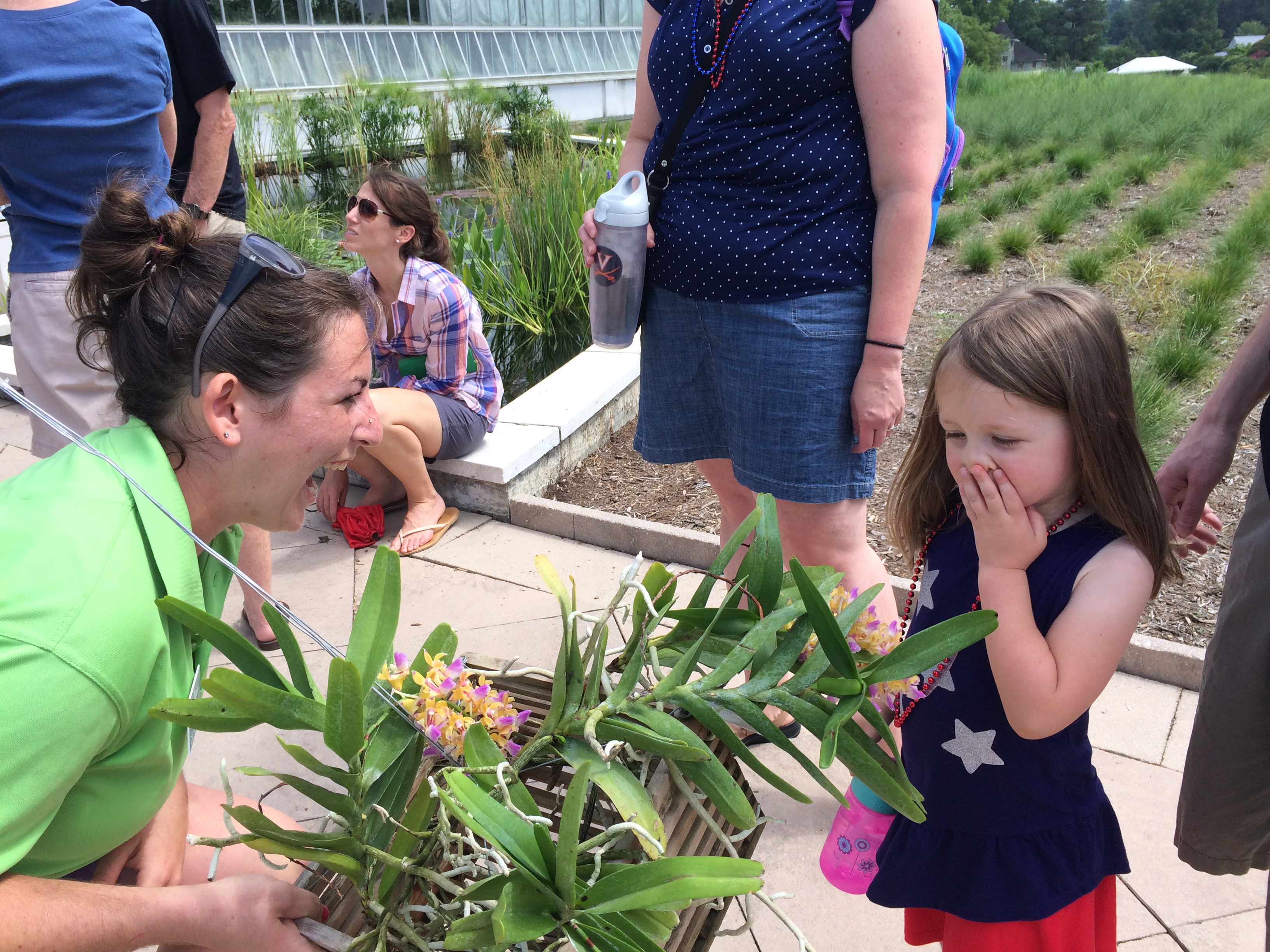 Smelling the arid orchid. Notice how there is not dirt for the orchid. It doesn’t need it. In their native environment these orchids grow in trees.
