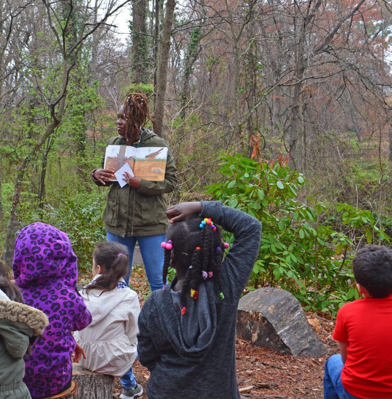 Tarneshia Evans reading a story to a field trip class at the “amphitheater” along the Tree Trail in the Children’s Garden.