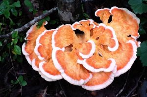 The colorful chicken of the woods mushroom obtains its nutrients from a host log of decomposing wood. photo by Steve Haas