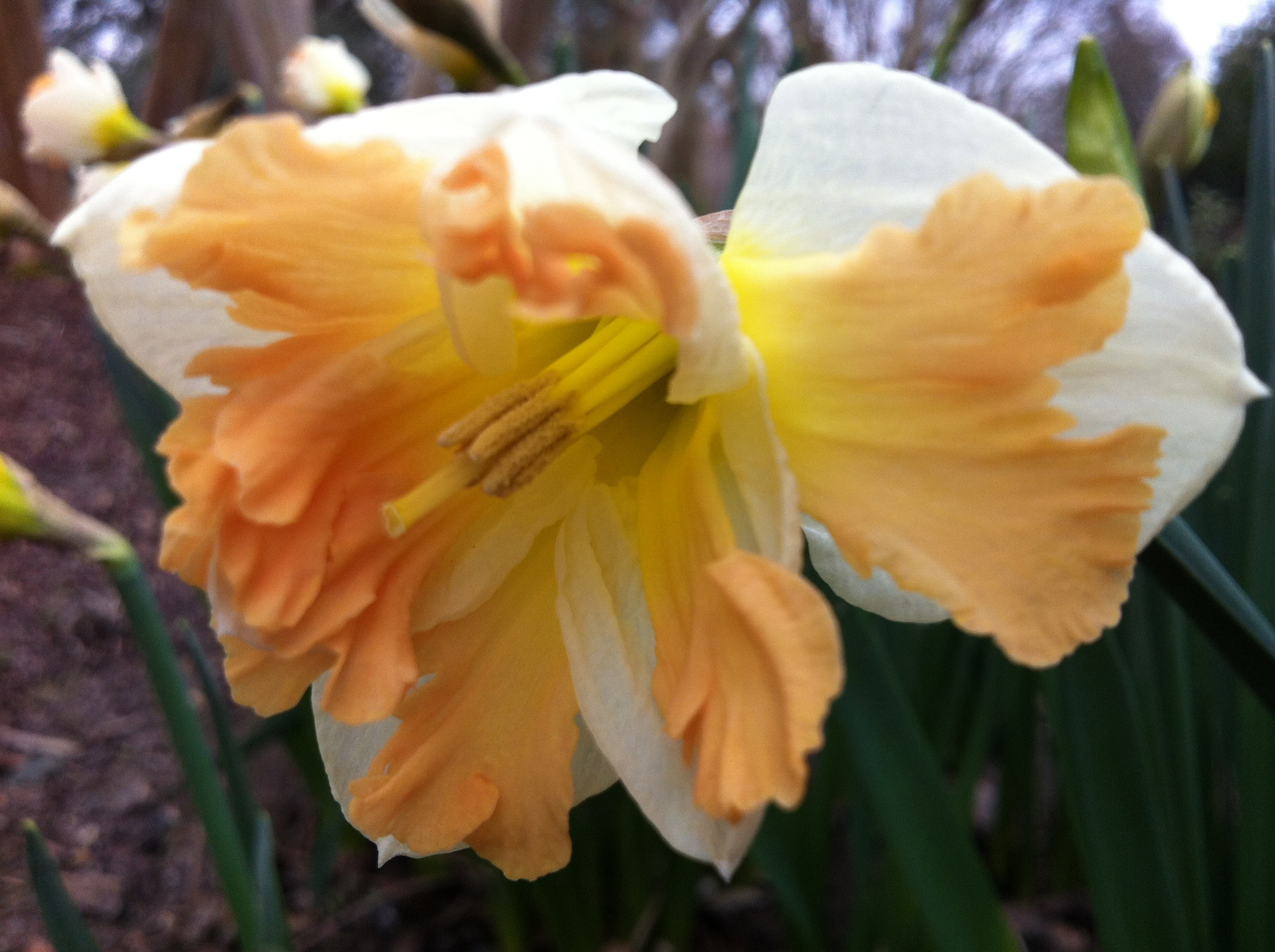 The daffodils are starting to bloom all over the Garden. For me one of my favorite things is to find a new type of daffodil every time I turn around. According to the American Daffodil Society there are between 40 and 200 different species, subspecies or varieties of species — and over 25,000 registered cultivars (named hybrids). That’s a lot of daffs! It also explains why I have trouble keeping track of them all. This one is Narcissus ‘Cum Laude’ from Brent & Becky’s Bulbs, a company from Gloucester, Virginia, who specialize in daffodils and unusual bulbs.