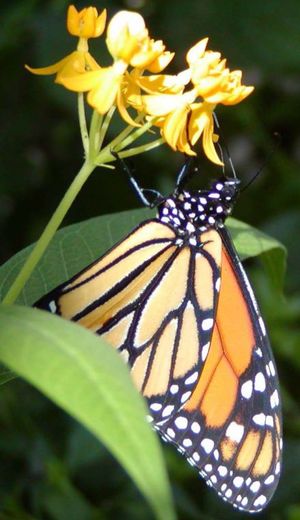 The leaves of the native milkweed provide a place for the monarch butterfly to lay its eggs, as well as providing a source of food for larvae that hatch.