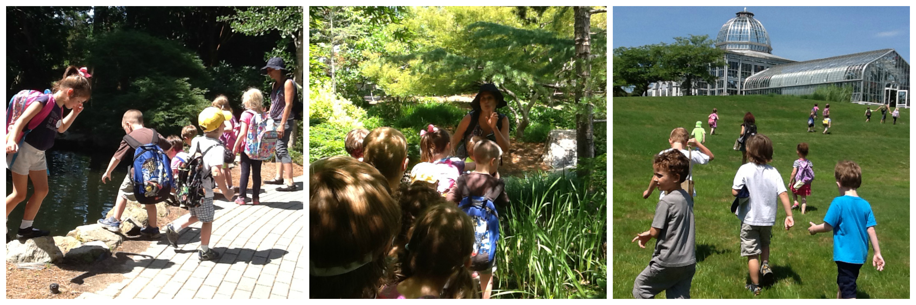 Left: Campers took a break to watch fish in a pond on the way to the “babbling brook.” Middle: Bryant prepared us to have fun and be careful before we crossed over the cascade. Right: The hill from the Cochrane Rose Garden to the Conservatory is huge, but all the campers made it to the top.