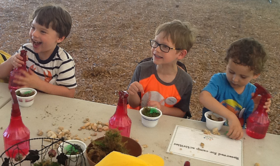 When I arrived at camp on Thursday, I found my fellow campers under at Flagler Pavilion, where they all sat on a blue tarp in shade for story time. I sat down nearby and listened to Children’s Garden educator Mitra Bryant read “Hector Fox and the Giant Quest.” The kids were really into the story…except when a pesky ant came around. One child would point to the ant as it got closer, and then they would all start whispering to each other about it. Bryant found it to be a teachable moment. She swept the ant away from the tarp gently saying, “We don’t want to kill insects because we’re in their world.”