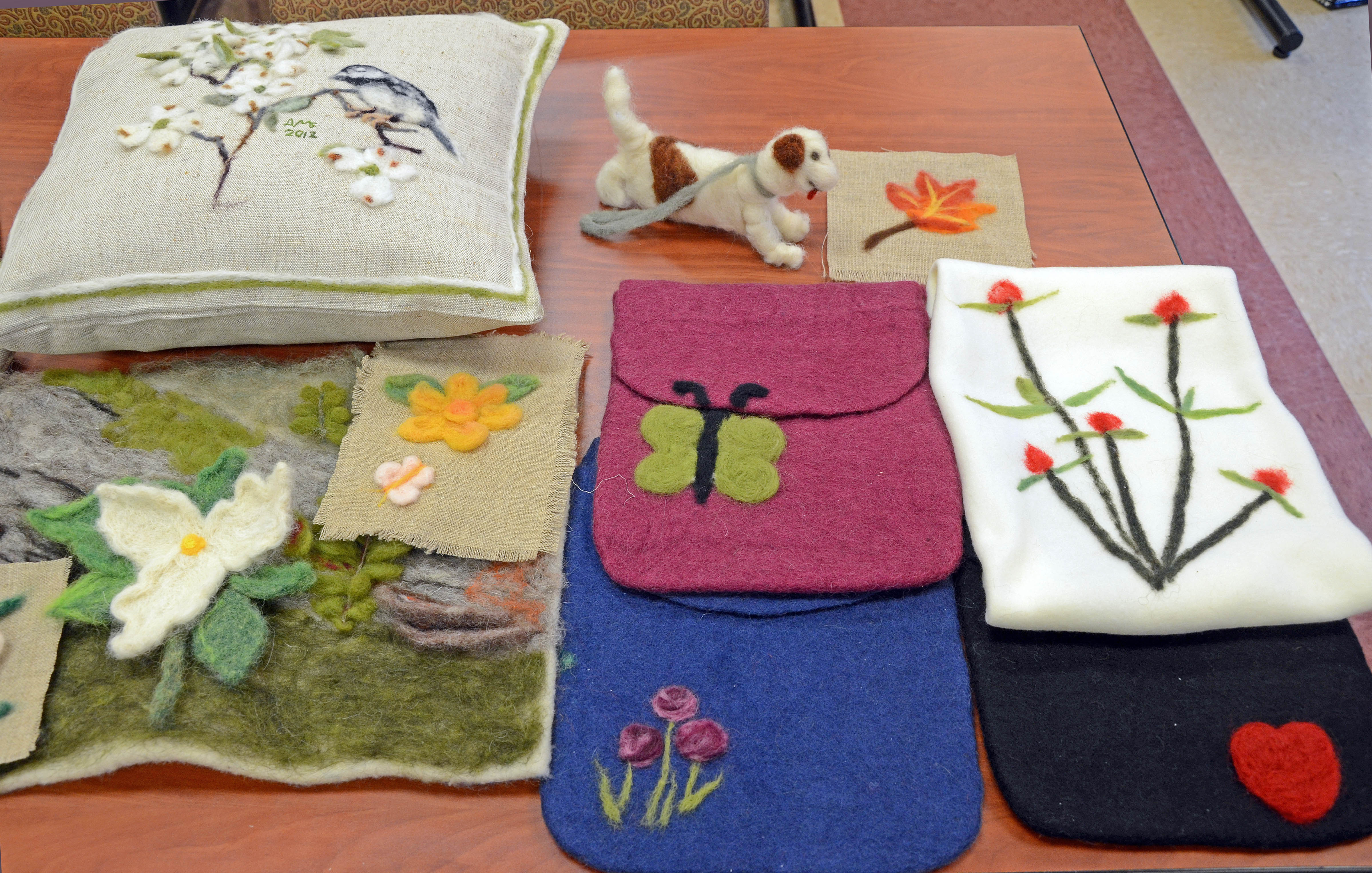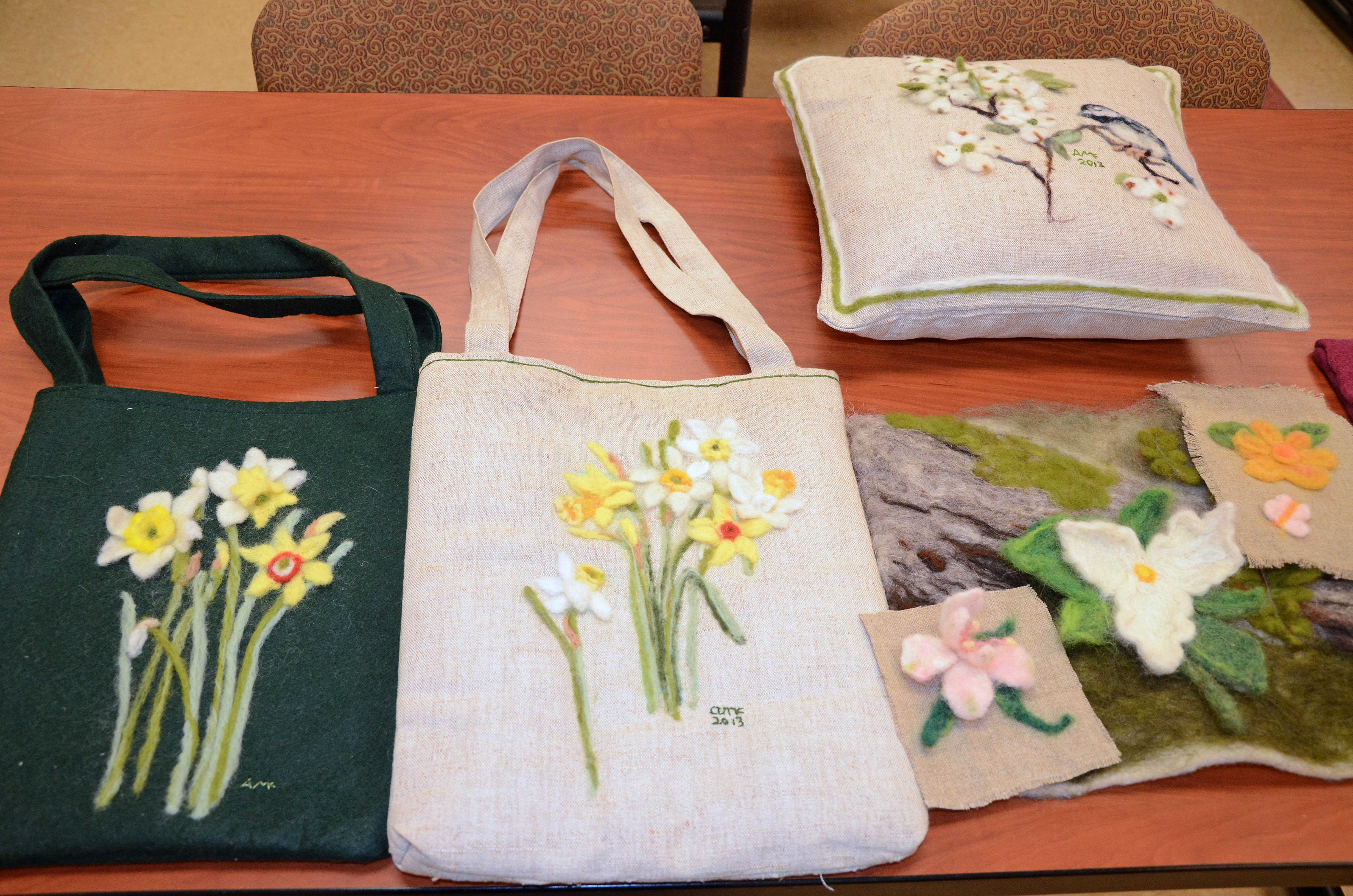 Needle felting is an old craft, but it is on the cutting edge in botanical art. I just finished teaching a session of “Needle Felting with Botanical Subjects” in the Art in the Garden program at Lewis Ginter Botanical Garden. What a fabulous class it was, with wonderful students! Below are some samples of their amazing work. The only other botanical needle felting class I have ever heard of is in Scotland, and I think this is the only such class in the United States.