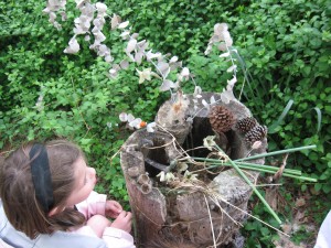 One thing that Chip said that really struck me is that sometimes it’s OK to let you children out of your sight. He talked about using a red backpack, centrally located, as a point that both the kids and the adults keep in sight and this method allowed his children to explore more independently and have more opportunities to use their problem- solving skills. For me this was a big deal, as I’ve always been one of those parents who won’t let their kids out of their site EVER. And with Chip and Ashley on site at the Garden on Wednesday night, I got to put it into practice — for the first time ever, I let my kids be in two separate areas of the Garden, each doing the thing they wanted to do. My son wanted to build his fairy house in the Children’s Garden mulberry tree and my daughter wanted to build hers down in the woodland point. Chip and Ashley addressed people’s fear directly. Why should I let my fear hinder my children’s experiences?
