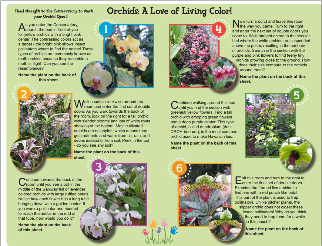 After picking up an Orchid Quest brochure at admissions, (or downloading one now) families use clever clues and mapping skills to find their way to a hidden treasure in the Conservatory. Along the way, children and their adults are encouraged to record the names of plants they encounter. Once the quest is completed, children receive a collectible button.