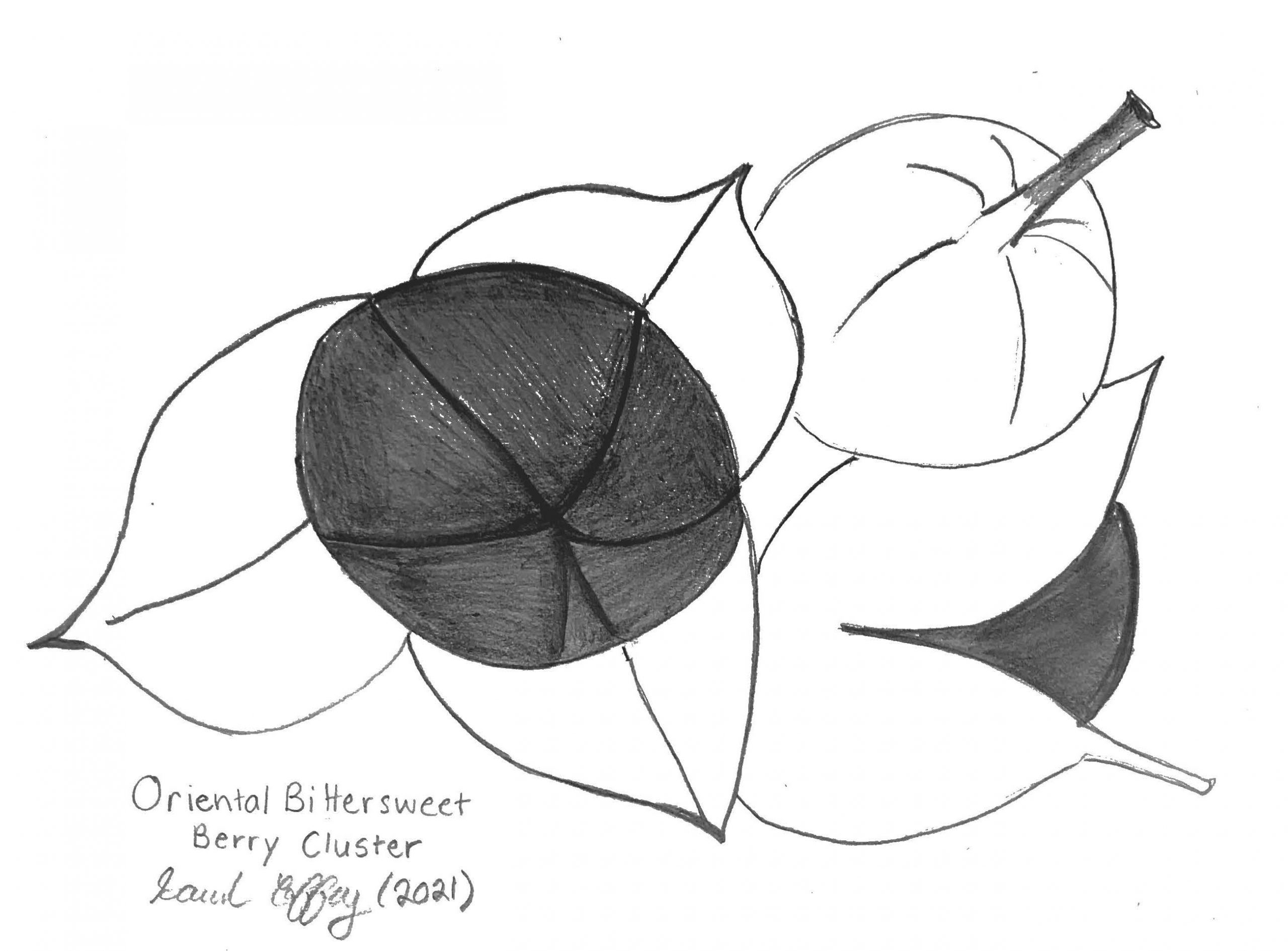 Oriental bittersweet berries are bright red with yellow skins. The top right berry’s skin has not yet split. Drawing by Sarah Coffey.