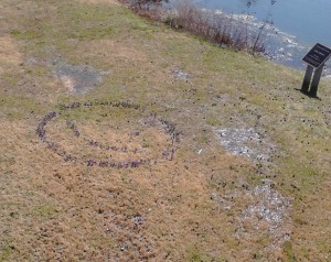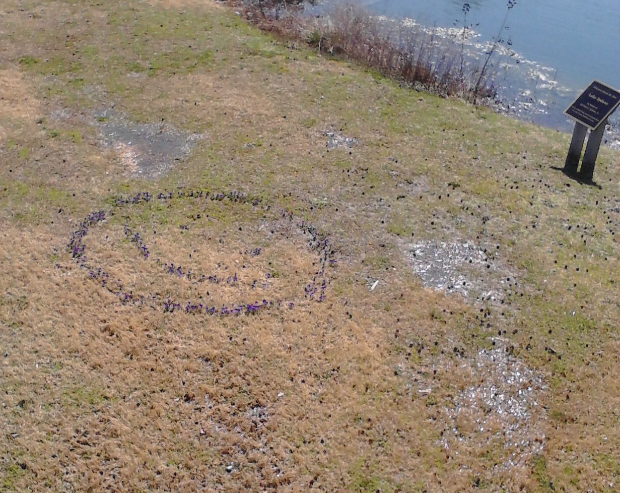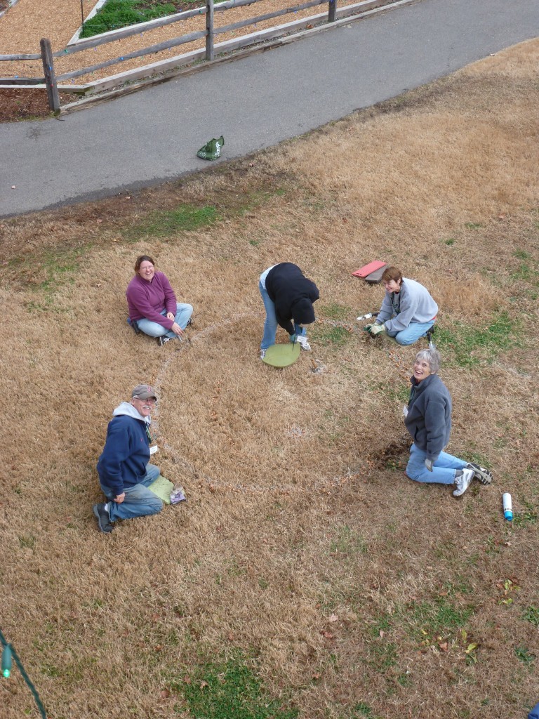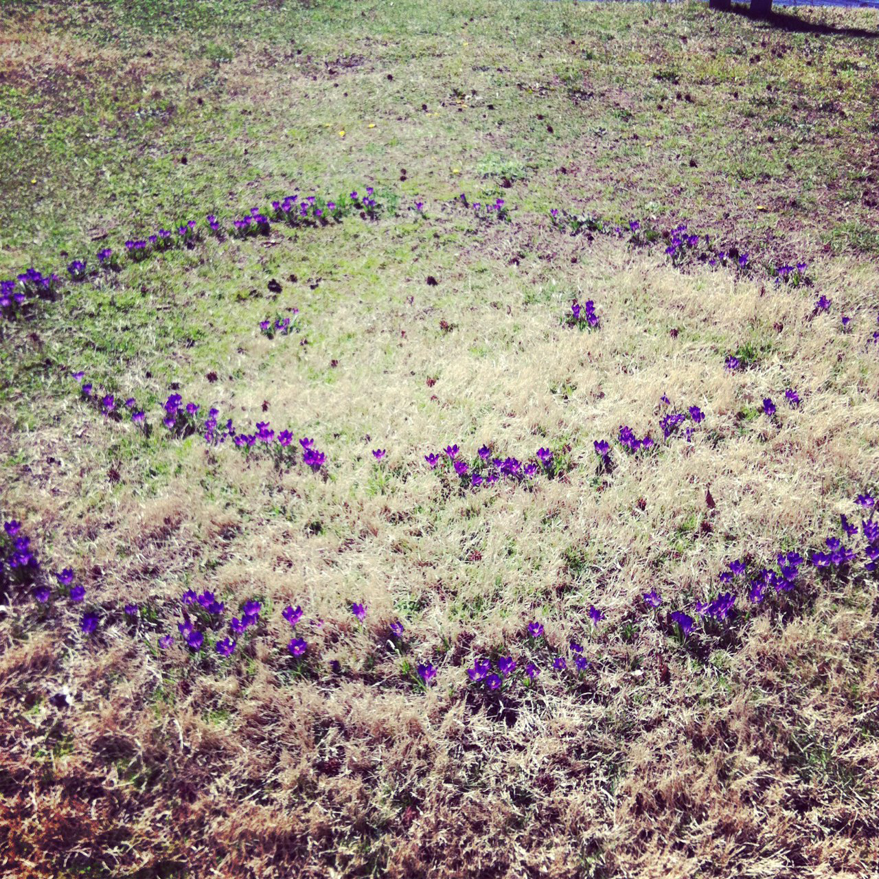 The Children’s Garden volunteers and I have been keeping a secret, but we can’t keep it any more. In December my Tuesday volunteer group and I planted 500 Crocus tommasinianus ‘Ruby Giant’ in the grassy area below the tree house.