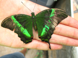 This was the banded peacock who completed his life-cycle. Guests were able to touch his wings to see the scales rub off.