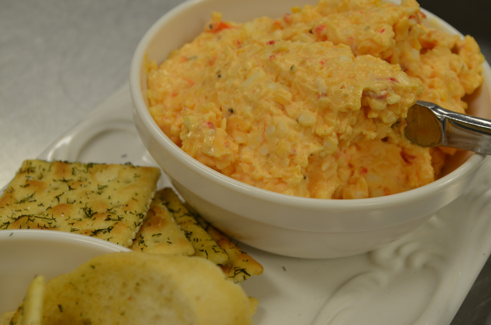 Chef Anne Maury making the famous Meriwether Godsey Roasted Red Pepper and Crab Soup. A tray of warm, house-made dill and sea salt crackers sits nearby.