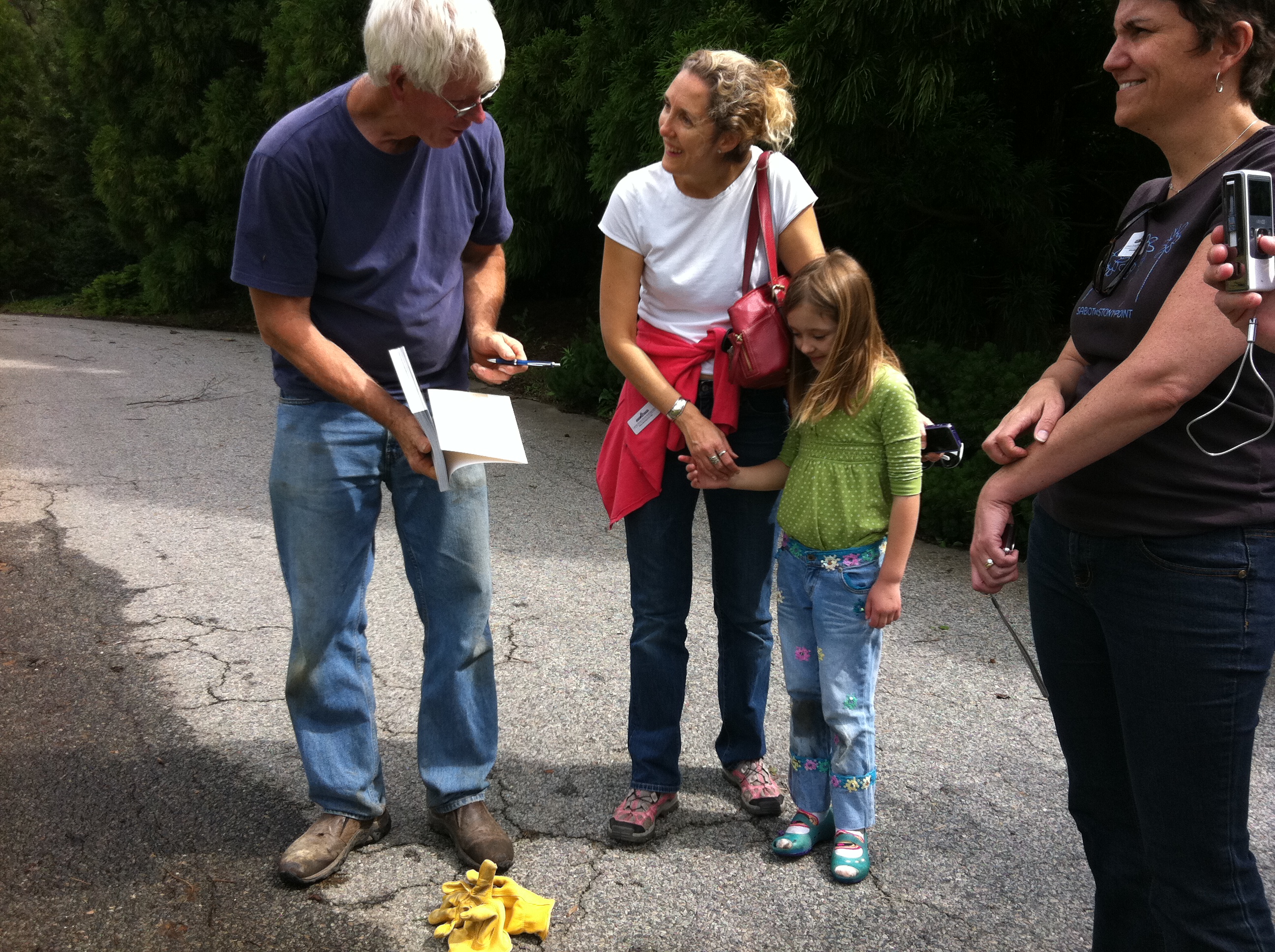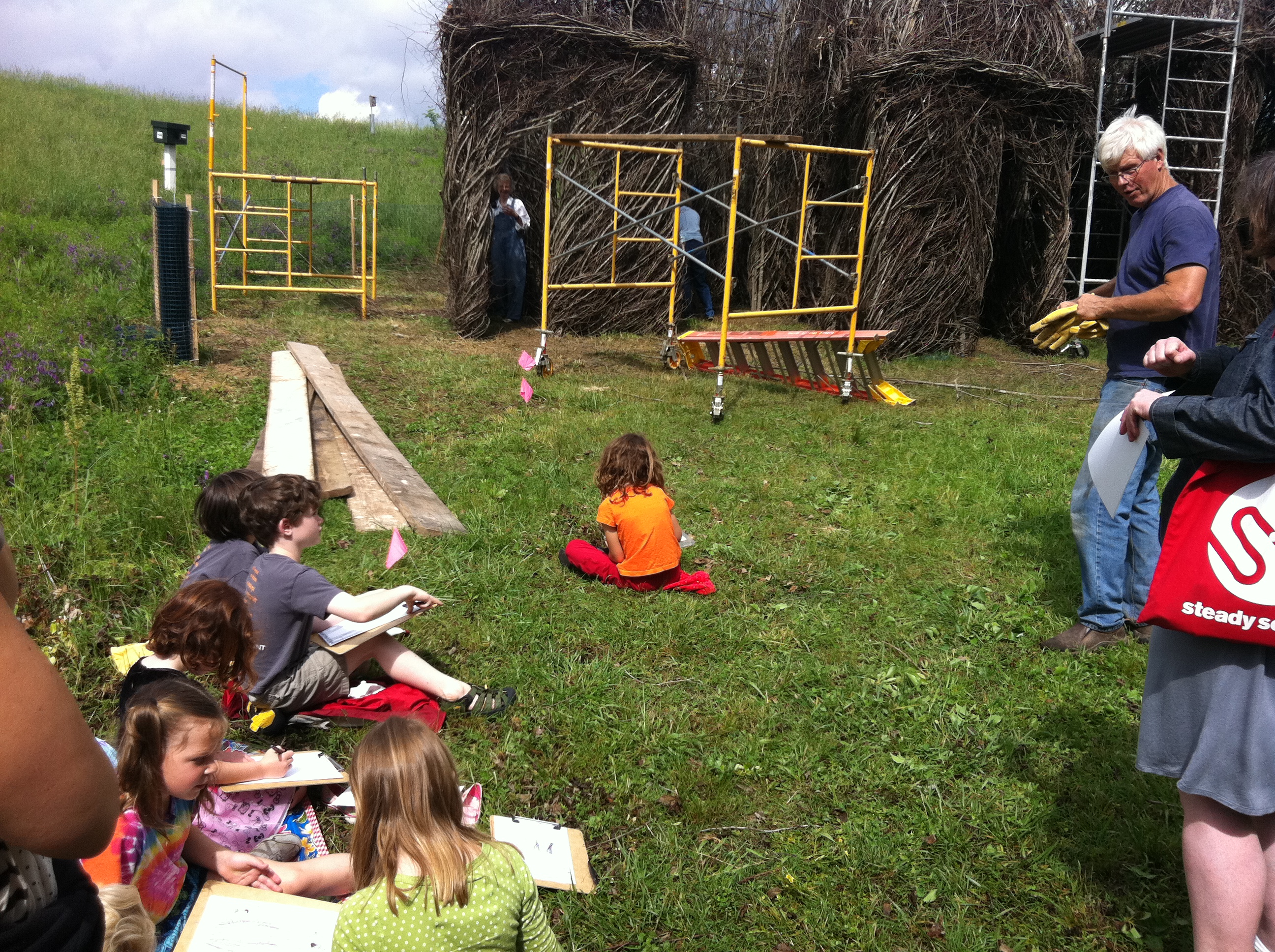 This morning I wandered down to the Anderson Meadow to see what progress had been made on the Meadowmorphosis stick sculpture. I was excited to see two entire classes of kids and their teachers — lingering around the sculpture and examining the massive installation that we’ve been creating over the past 2 1/2 weeks. One school group was headed out as I approached, but the other, I could see as I got closer, was actually sitting on the ground with clip boards and paper, sketching their own versions of the Meadowmorphois on paper. As I got even closer, I realized that these were my son’s former classmates from Sabot preschool — now Sabot at Stony Point School. Several of the children and parents recognized me and quickly I discovered from the parents and teachers that the 6-year-olds have been creating birds’ nests back at their school. As soon as they found out about Patrick Dougherty’s project they knew they had to schedule a visit to the Garden.