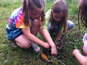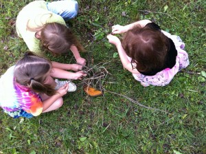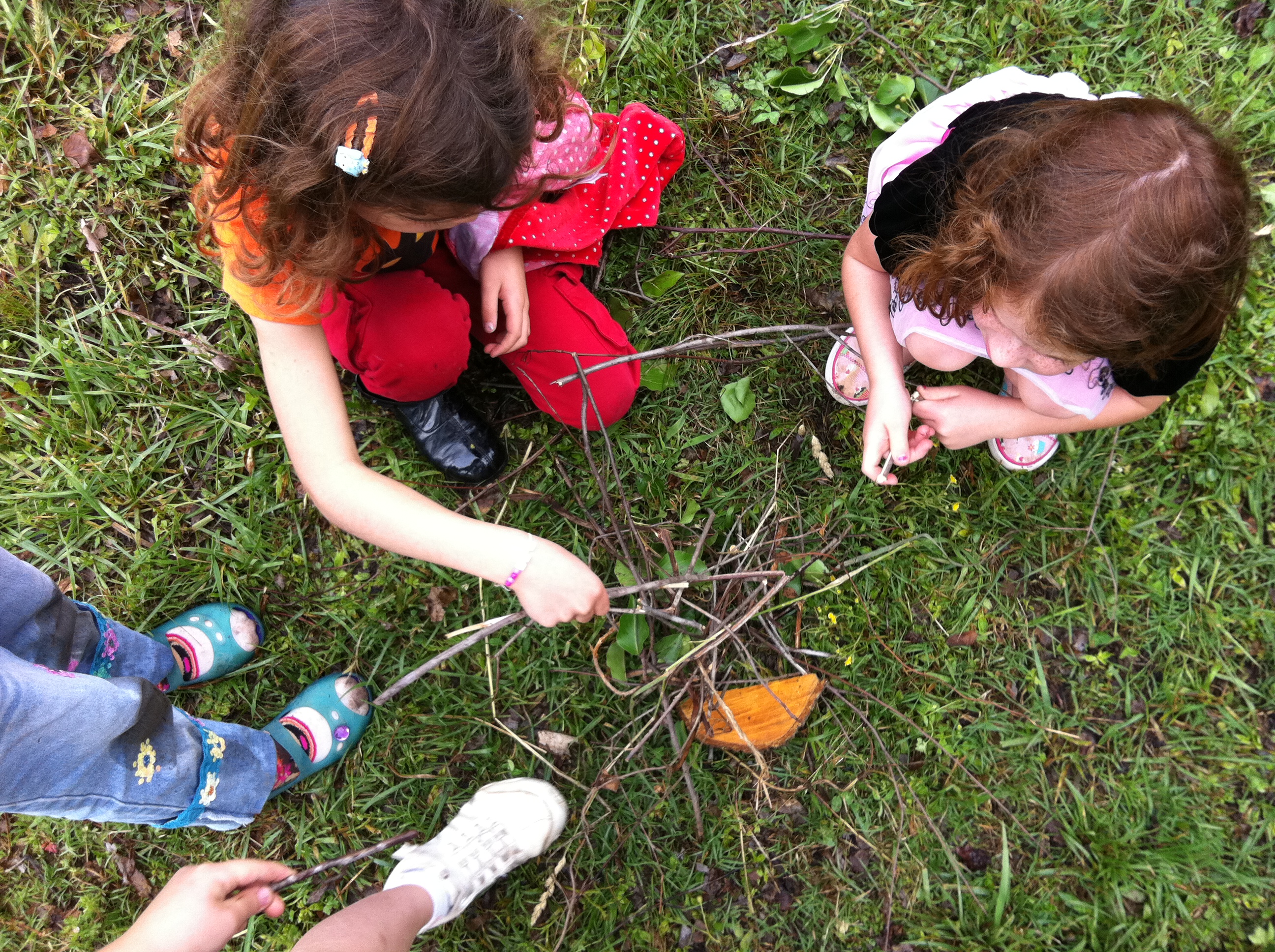 Soon after I left them, clip boards were tossed to the ground, and children started looking for scraps of sticks in the meadow. In just a few minutes they were creating their own miniature stick sculptures alongside Patrick’s giant one. I couldn’t resist filming a quick video of them working — listen carefully to the audio. Their joy in creation and in working together is inspiring to me. Who will it be for? A fairy? A small person? A bird?