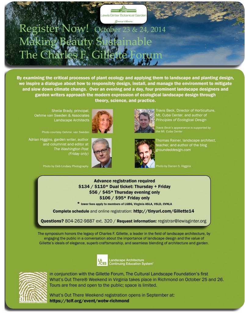 By examining the critical processes of plant ecology and applying them to landscape and planting design, we inspire a dialogue about how to responsibly design, install, and manage the environment to mitigate and slow down climate change. Over an evening and a day, four prominent landscape designers and garden writers approach the modern expression of ecological landscape design through theory, science, and practice. Please join us for this year’s Gillette Forum featuring Sheila Brady, principal, Oehme van Sweden and Associates, Inc., Travis Beck, author of Principles of Ecological Design, Director of Horticulture, Mt. Cuba Center Inc., landscape designer, teacher, GroundedDesign blogger Thomas Rainer, and Adrian Higgins, writer and editor at The Washington Post.