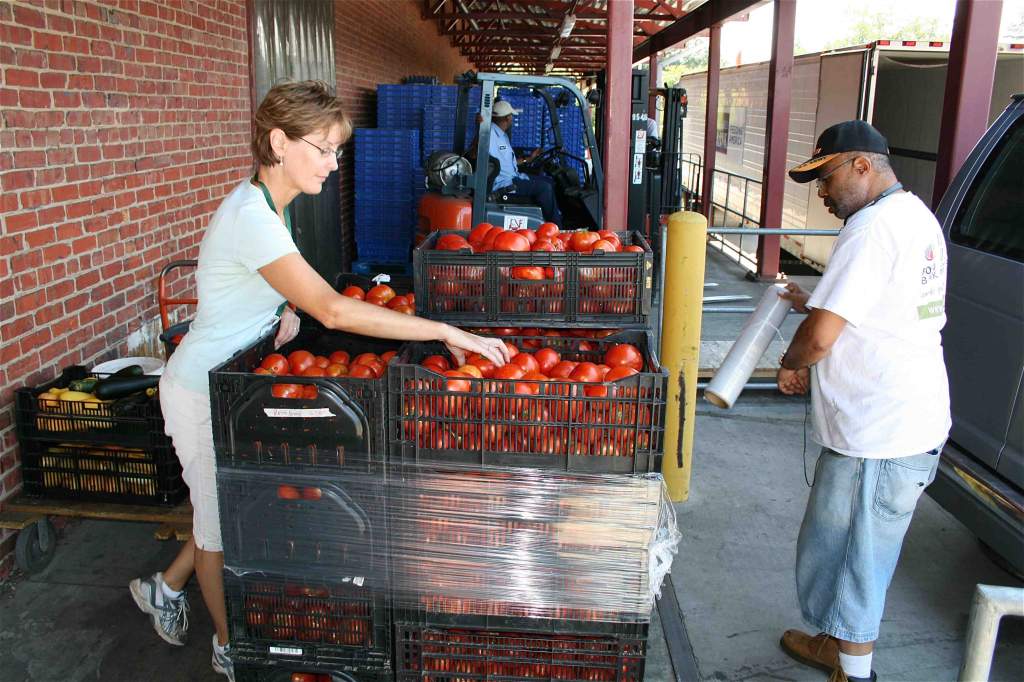 When we rolled up to the Central Virginia FoodBank loading dock we were greeted by FeedMore’s Paul Adams. Paul played football and baseball for Virginia Tech in the mid-70s. Paul entered the collegiate ranks as a .338 hitter with home run power, then focused on football. A four-year letterman running back in football, in 1976, Paul shared VT individual honors for Most Points Scored in a Game (12, vs. Tulsa). Paul still retains his athleticism. He easily lifted 3 crates of tomatoes at a time to help us unload the van. After I lifted my lower jaw from the concrete loading dock I helped Lisa Tedder & Paul unload the produce, power lifting my crates – one at a time.