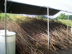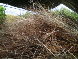 Whoa! Today we had some serious strippers on site—leaf strippers, that is! The mountain of ready-to-weave sticks is finally bigger than the pile of leafy sticks. Thanks to all who answered the call to action—we made significant progress today and when Patrick and Andy return today, they will have plenty of material to work with. A few hearty souls even came over the weekend to strip leaves—thanks to everyone who contributed.