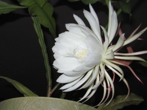 In the 1930’s in Jackson, Mississippi, The Night Blooming Cereus Club was formed by Eudora Welty and her artistic friends, many of whom were also writers. This tongue-in-cheek group’s motto was “Don’t take it too cereus. Life’s too mysterious”. One of the group, Hubert Creekmore, described the party to watch the spectacle of the opening of the flower. “We’d sit mesmerized, as the bud trembled and shuddered while it unwound its long slender white petals and spread them before our incredulous eyes as a delicately incised saucer full of froth” (One Writer’s Garden, p. 105)