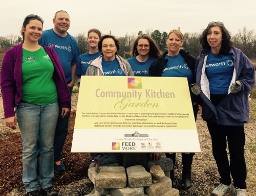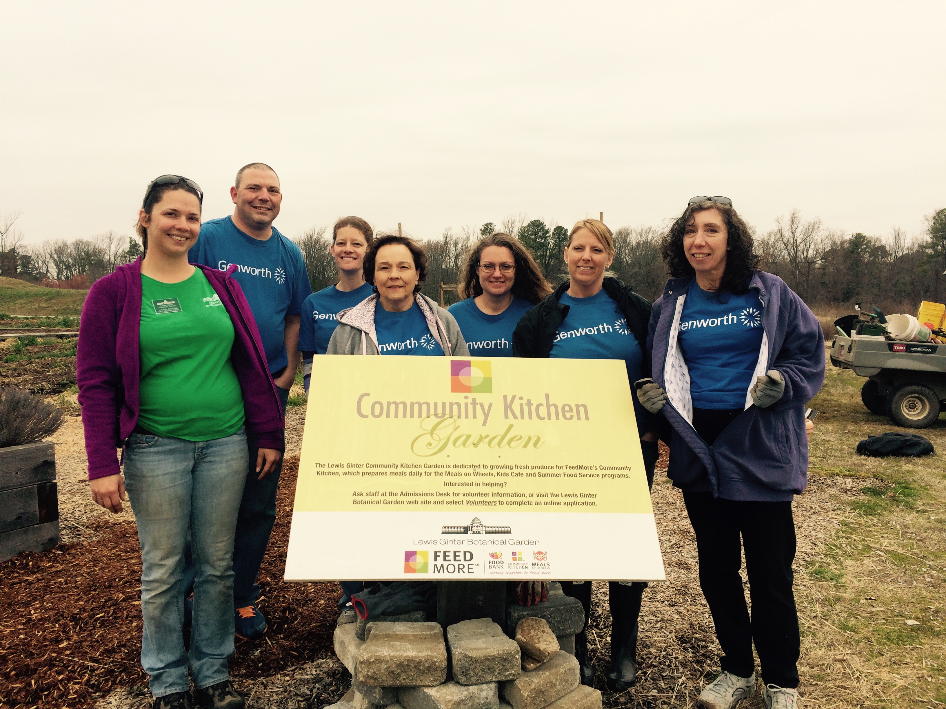 Laura Schumm, Community Kitchen Garden Horticulturist (left), with Genworth volunteers in the Community Kitchen Garden