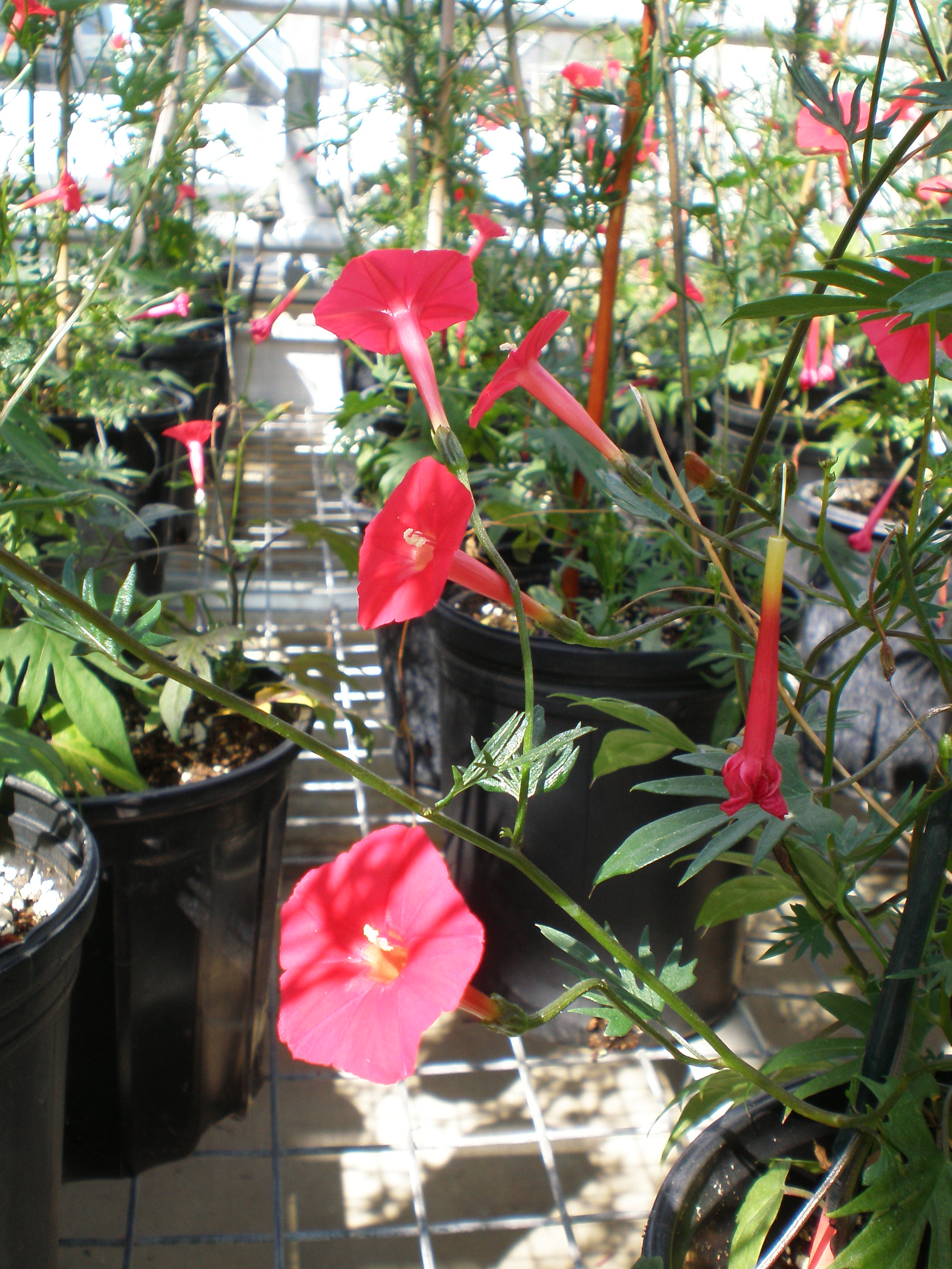 Lots of perennials too! A few especially caught my eye — Hyacinth bean (Lablab purpureus) and the Mandevilla vine (Mandevilla splendens.) The Cardinal Creeper (Ipomoea quamoclit) is shown below – the photo fails to capture the beauty.