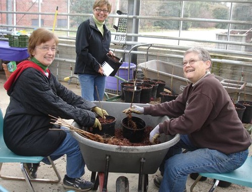 Pat Rooney, Ellen Edmonds and Betsy Slade (left to right) potting and labeling trees for the plant sale.