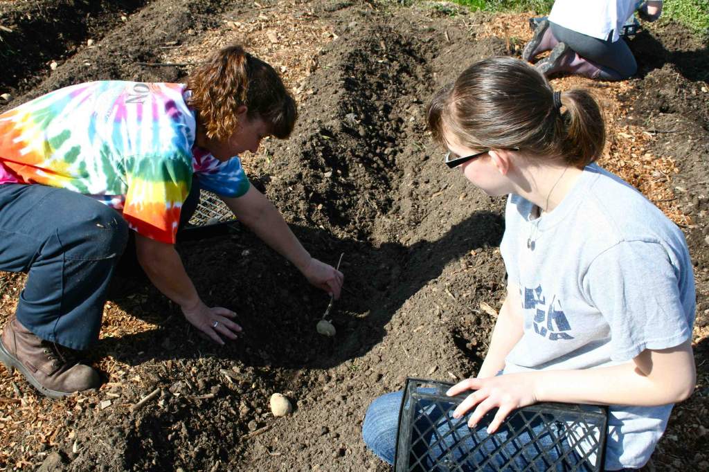 On St. Patrick’s Day, a lucky group of seven planted Red Pontiac potatoes in the Lewis Ginter Community Kitchen Garden, adding to the 335 seed potatoes and/or cuttings we planted earlier this month. While there’s no guarantee all will sprout and produce, we had some very strong eyes (potato eyes) on our cuttings, and the volunteer crew took great care with the planting. With a little nurturing we hope this effort will produce a nice delivery of new potatoes by the end of May for FeedMore’s Community Kitchen.