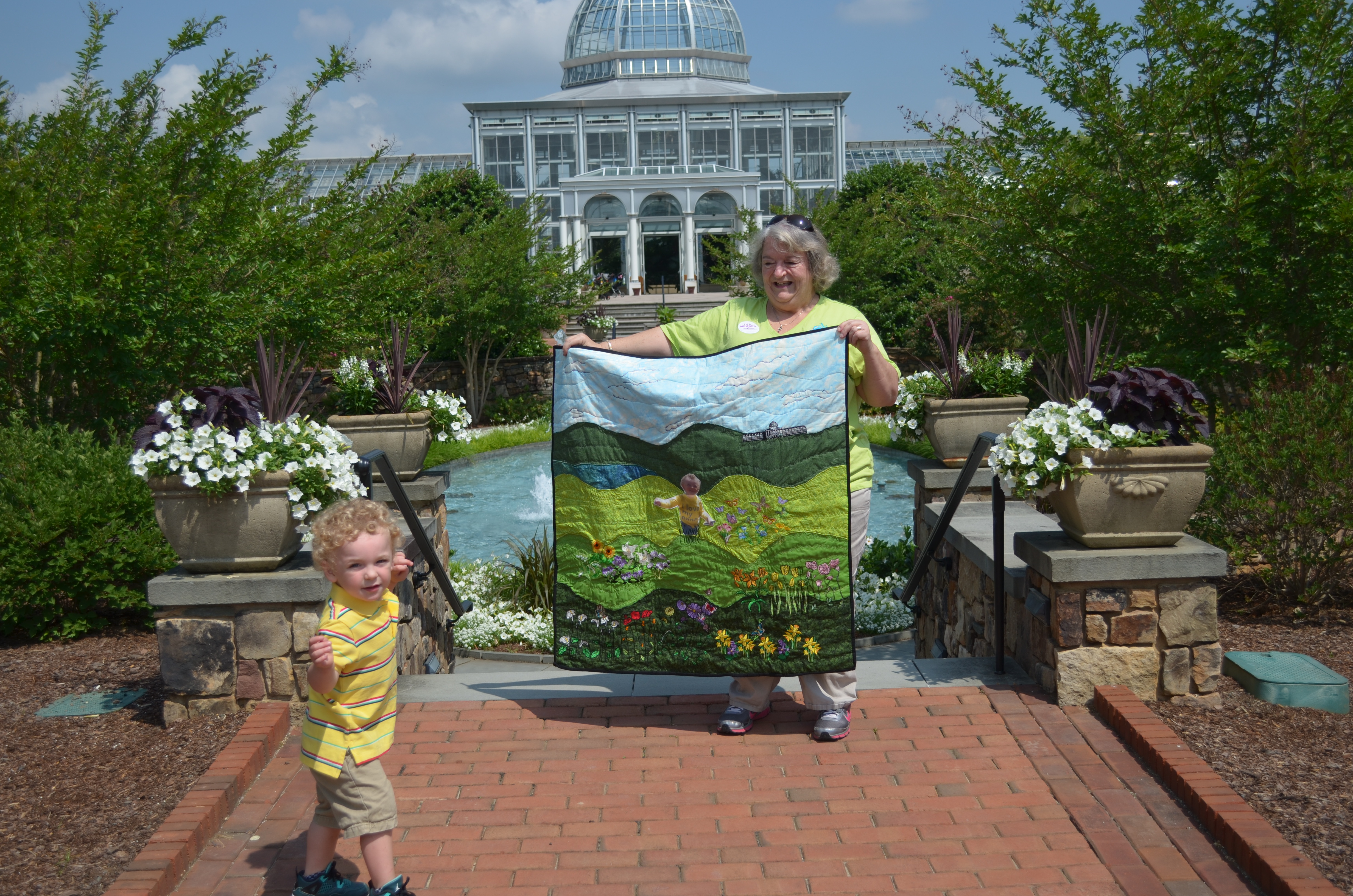 Wow, what a nice note to get! I knew I had to share it with you all, the readers of our blog, who are our biggest fans! My next thought was, How in the world did she get that great photo of her grandson and the Conservatory onto a quilt!? Page explained that she actually printed the picture on her home computer printer onto canvas and then sewed it with her machine. If you look closely you can see details of embroidered flowers and butterflies too. Amazing.