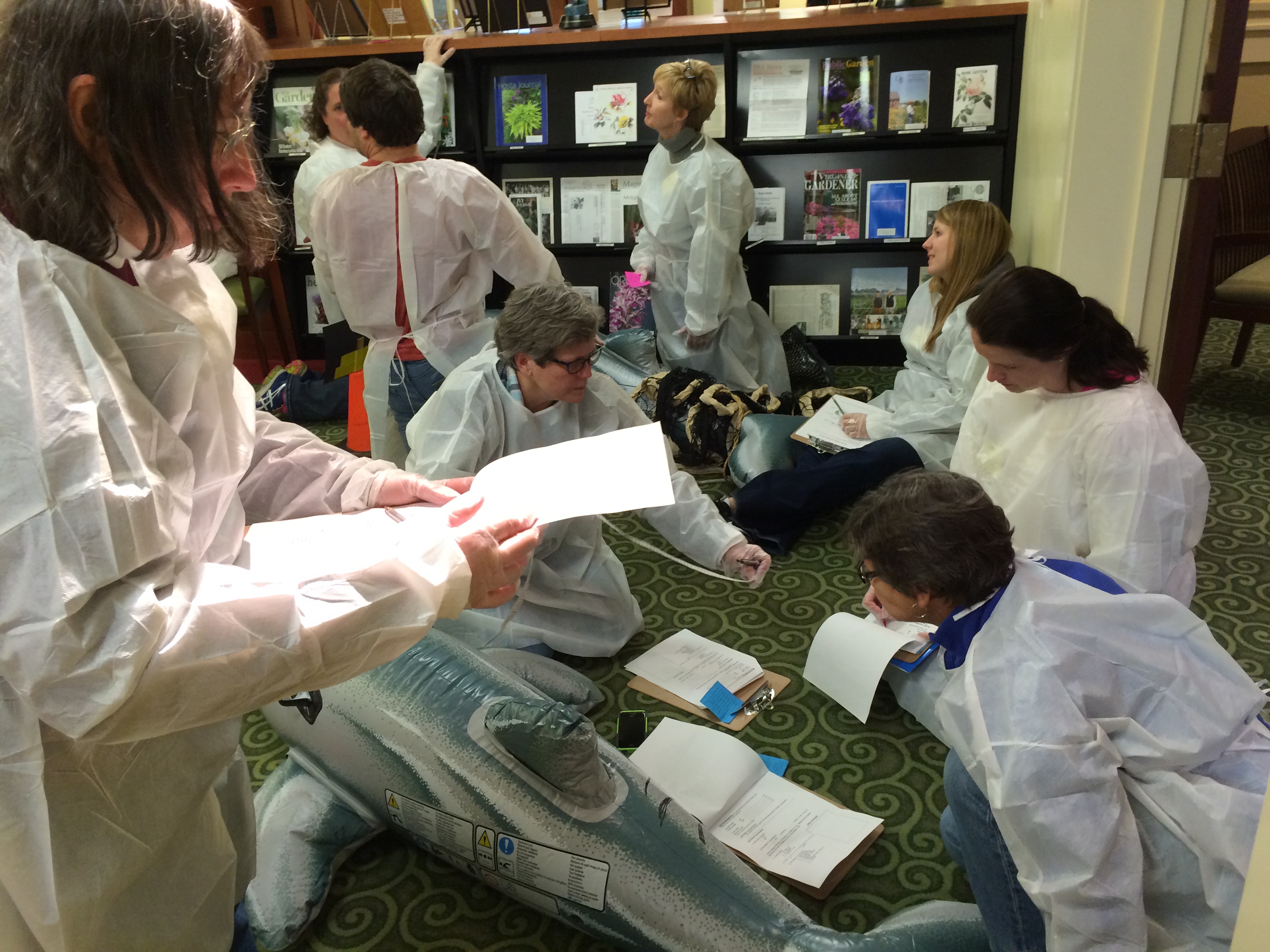 We wanted to share some photos of what hands-on teacher learning looks like and also wanted to share some comments with you about what our teachers liked about our conference. I think it’s a safe bet that they will try to duplicate the things they liked about our workshop when they do the same lessons with their own class later this year! As you can see, the photos are from a mock dolphin stranding. In Dolphins ASHORE – Assuring Students Have Opportunities for Researching our Environment, participants learned how to implement a mock dolphin stranding at their school. This is guaranteed to excite and engage students and teachers get to integrate your stranding with multiple math concepts, reading, scientific investigation, ocean, natural resources and the study of water.