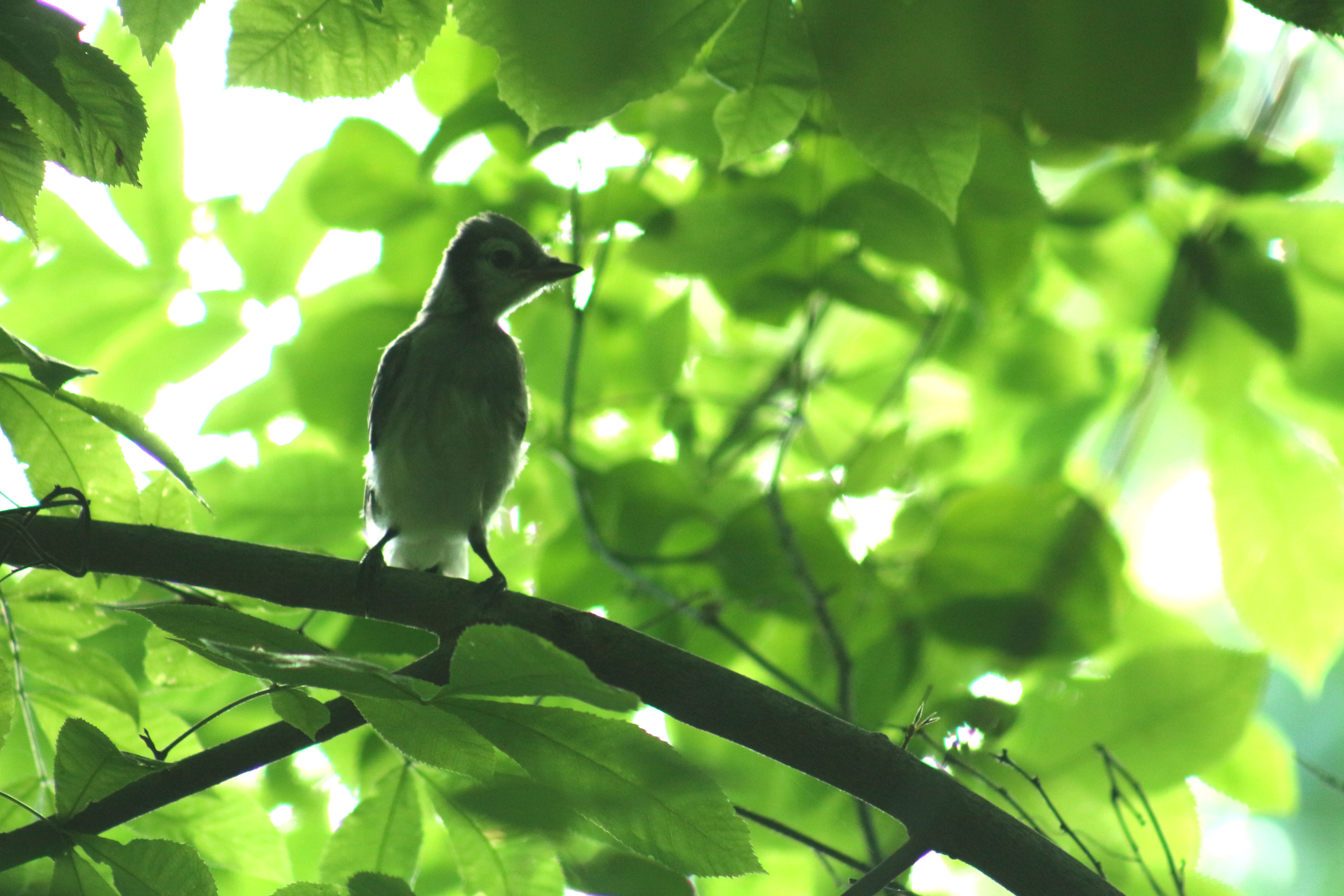 This toddler blue jay is calling after her siblings as she is the last to take her first flight, a moment you might only experience at the first of the day.