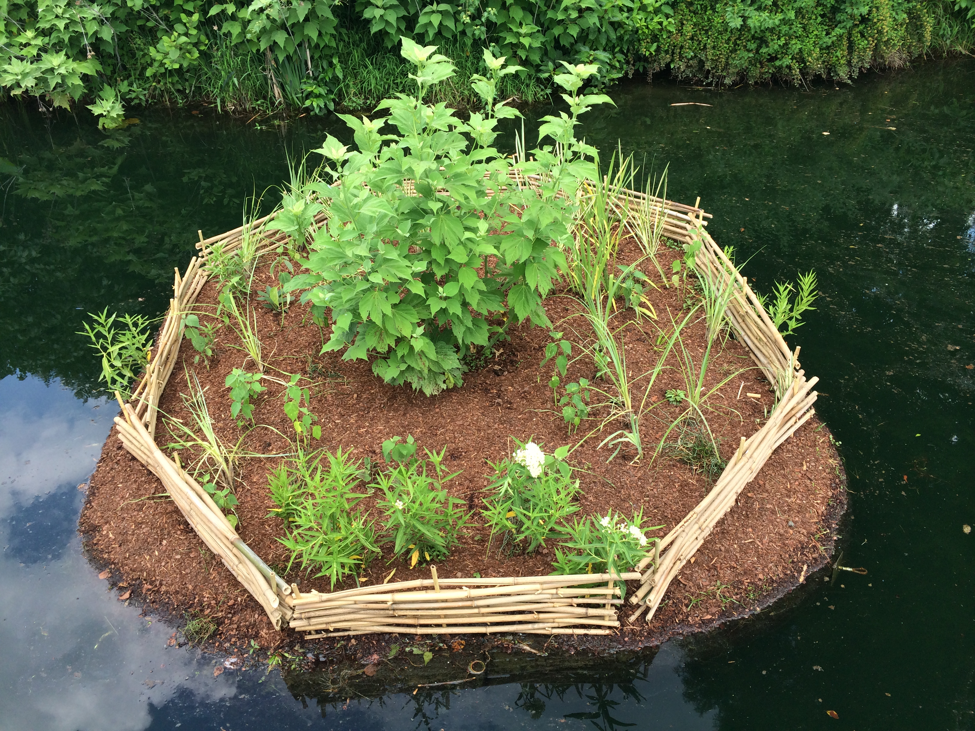 Plants on the Floating Island Garden are full grown now, but when it was first launched it looked like this. The bamboo fencing keeps our resident turtles from feeding on the plants.