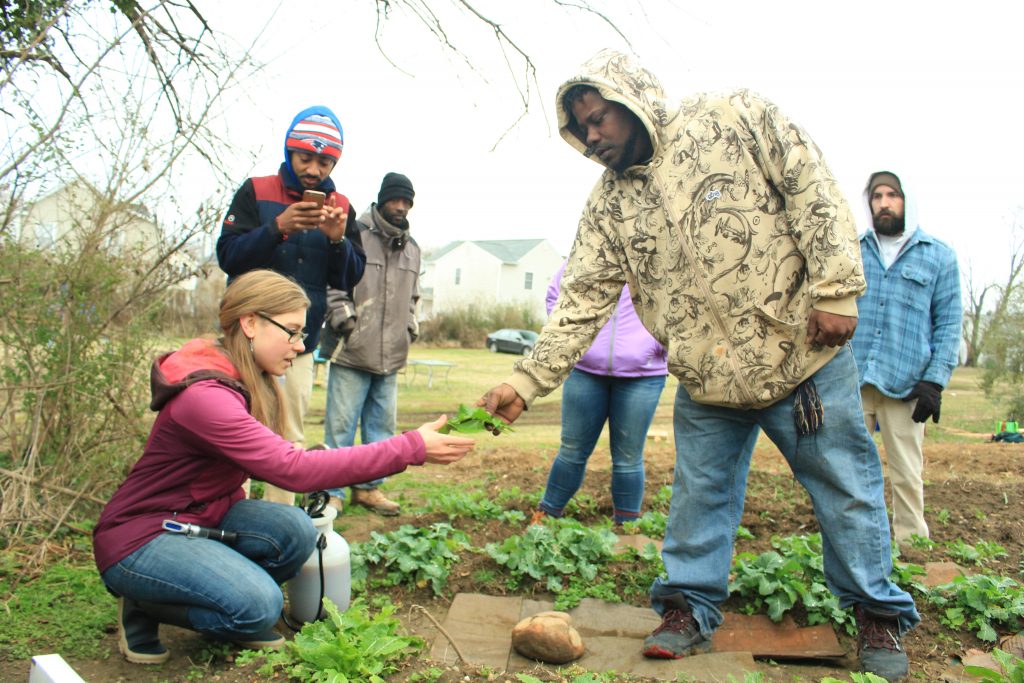 Soil expert Jessica Smith showing the Ginter Urban Gardener class how to extract kale juice from a leaf to test its nutrients. Photo by Phuong Tran
