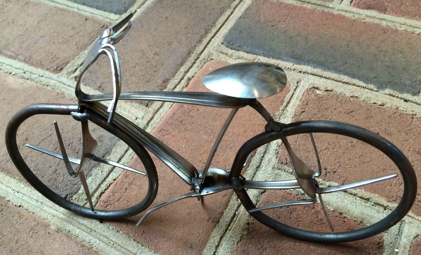 Aug 4th, 2015 forkbikenewcrop by Susan Higgins Table forks and spoons are re-purposed to make a miniature bike.
