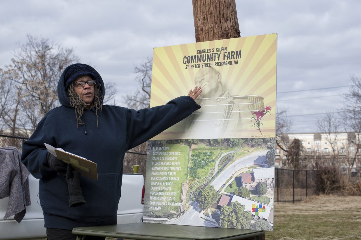 Lillie A. Estes, a Gilpin Court resident, unveiled the Charles S. Gilpin Community Farm site plan on Martin Luther King Day 2018.
