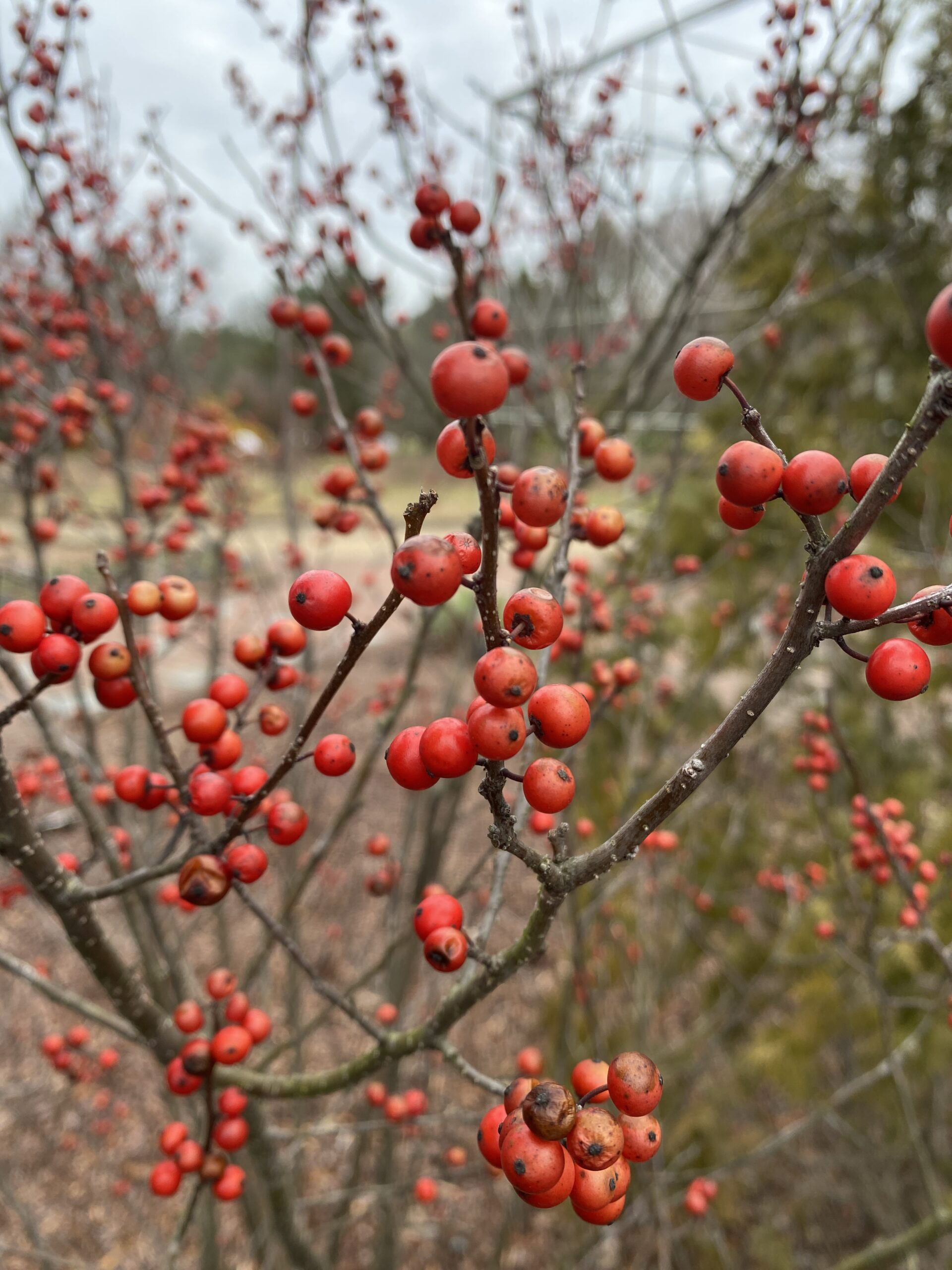 Nature tosses a spray of scarlet orbs into the lackluster landscape this time of year, decorating the bare branches of Winterberry holly with much needed nourishment for local wildlife.