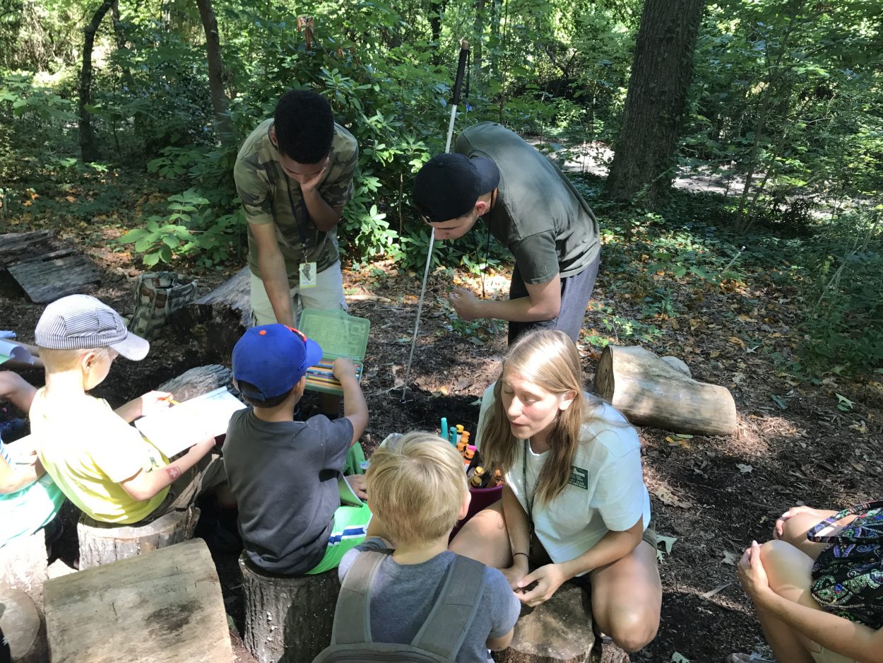 David observing and learning as a helper at Green Adventures summer camp. Mayor’s Youth Academy intern Jamari stands nearby. Children’s Garden Educator Kelsey Deans hands out shovels so the kids can dig in the dirt. Roxana Wolburg sits on stump, right.