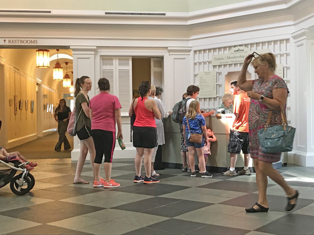 David (in the orange shirt) working with admissions staff to welcome everyone and making sure they have stickers before they enter the garden.