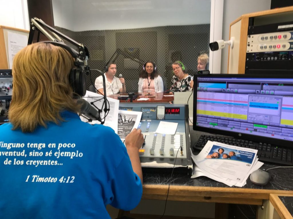 The view from behind the mic at Radio Poder. Show host the Rev. Arlene Guzman facing the radio board with David, Roxana Wolburg, Jonah Holland and Karen Bunn.