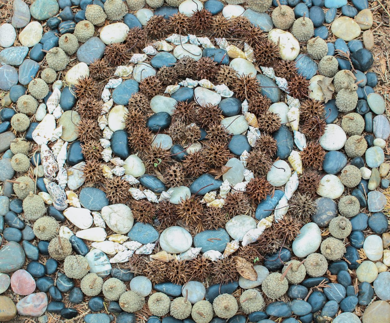 Mandalas are one of humankind’s most ancient art forms. From the Sanskrit word loosely translated as “circle”, the geometric patterns radiating from a center point mimic the repetition of circles found in nature: the sun, planets, birds nests, and even circles of friends and families with in a community. Create your mandala with pine cones, sweet gum balls, bur acorns, stones and shells.