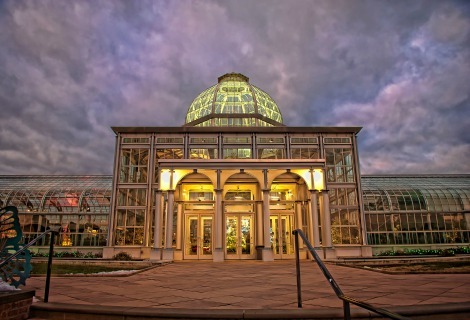 Crowned by a 63-foot-tall dome, the Conservatory includes a central Palm House housing our palm and cycad collection; the semi-tropical East Wing features tropical plants, including our orchid collection; our cacti and succulent collection is on display in the West Wing; and the North Wing hosts changing themed displays full of seasonal color and interest including a holiday tree during Dominion GardenFest of Lights.
