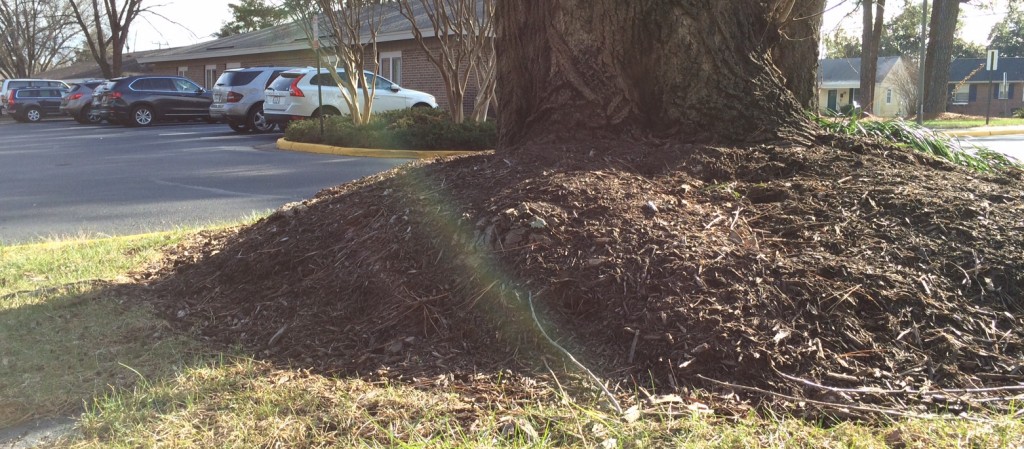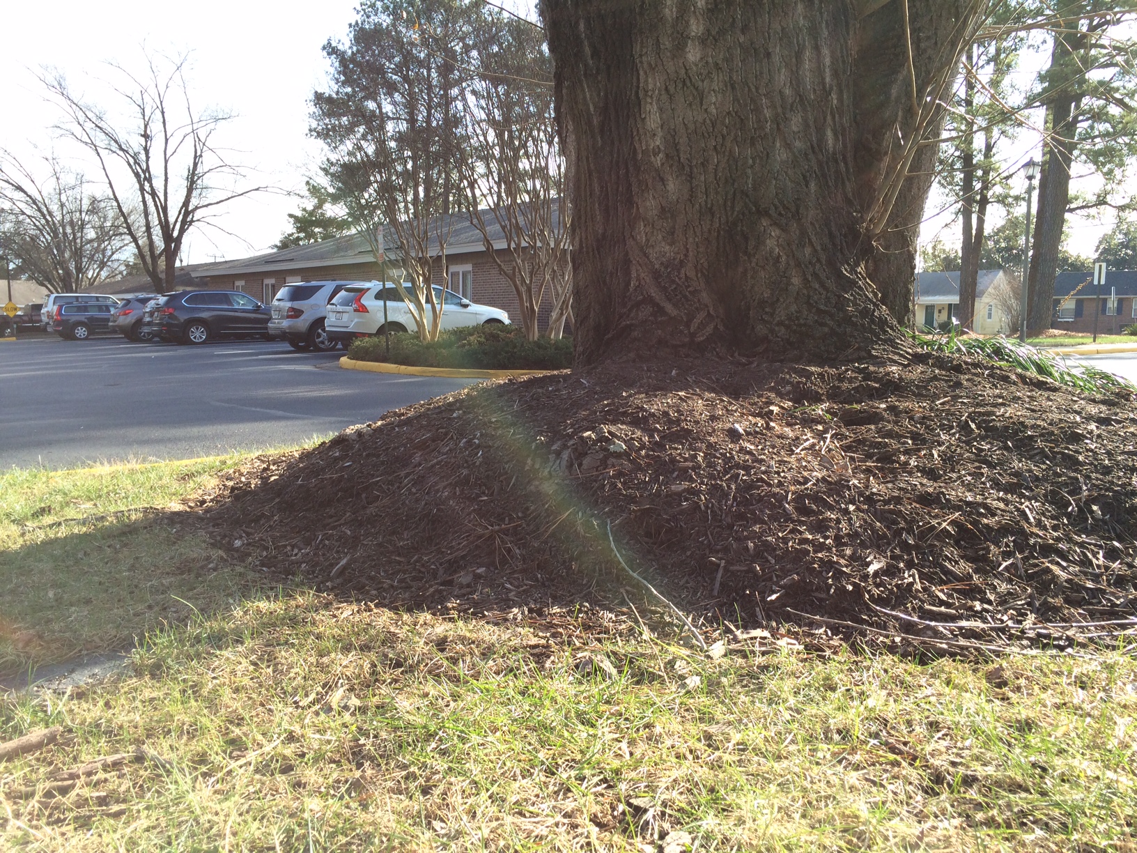 Those of us who are guilty of over-nurturing when we garden will sometimes pile mulch into deep pyramid-shaped hills that push up against the base of a tree. Although they are commonly found, horticulturists and savvy gardeners call these man-made menaces “mulch volcanoes.” They can be devastating to the tree.