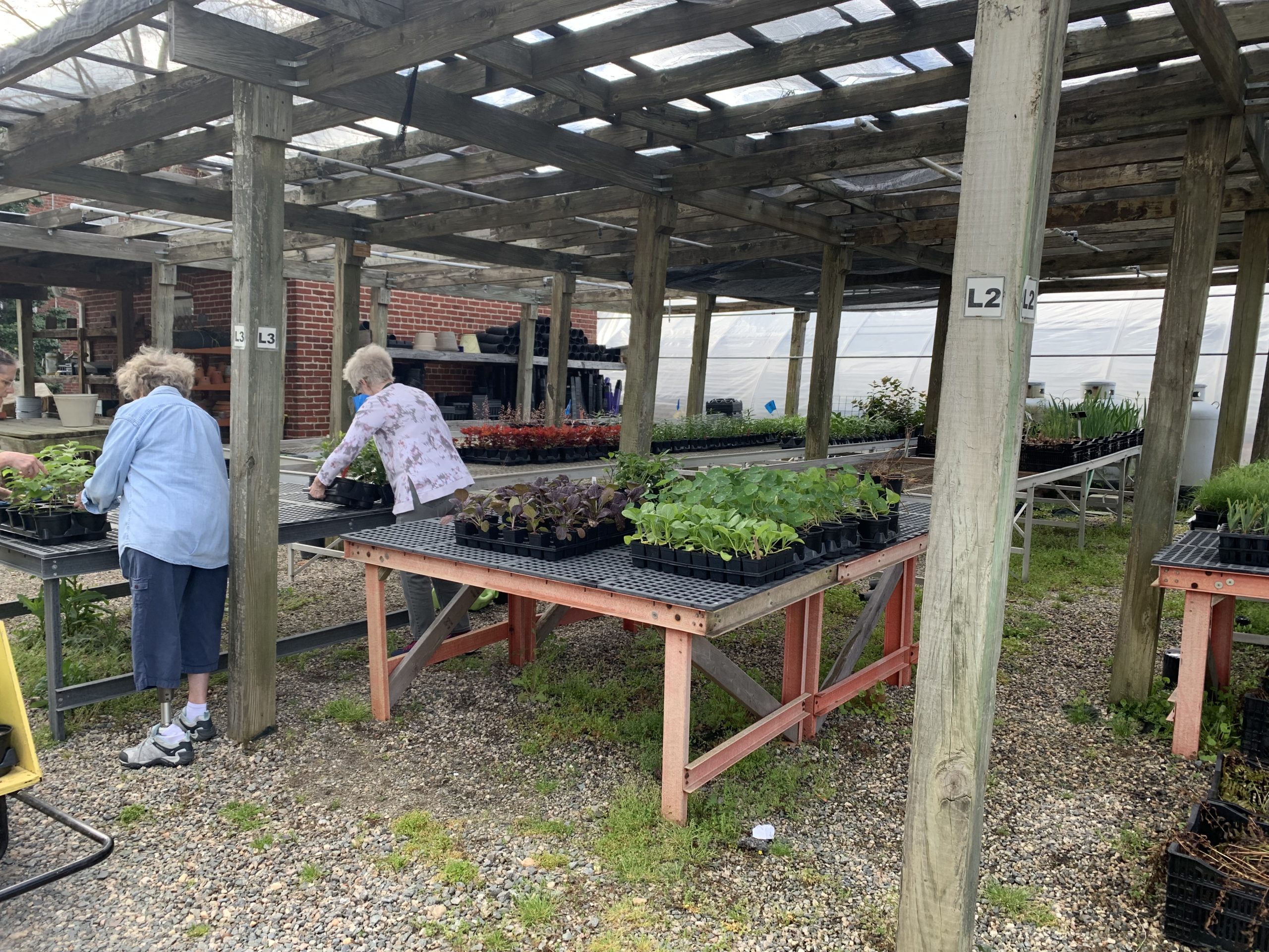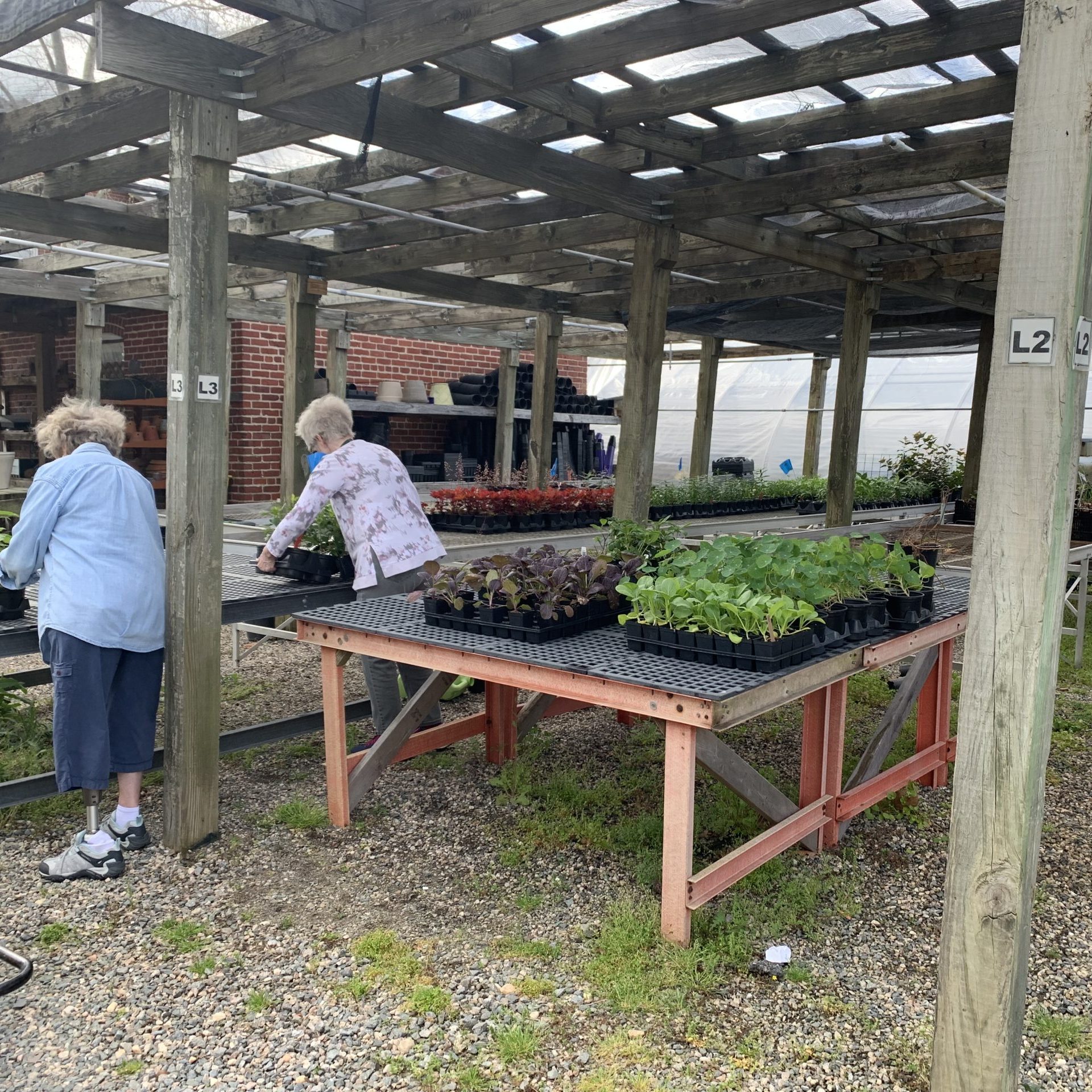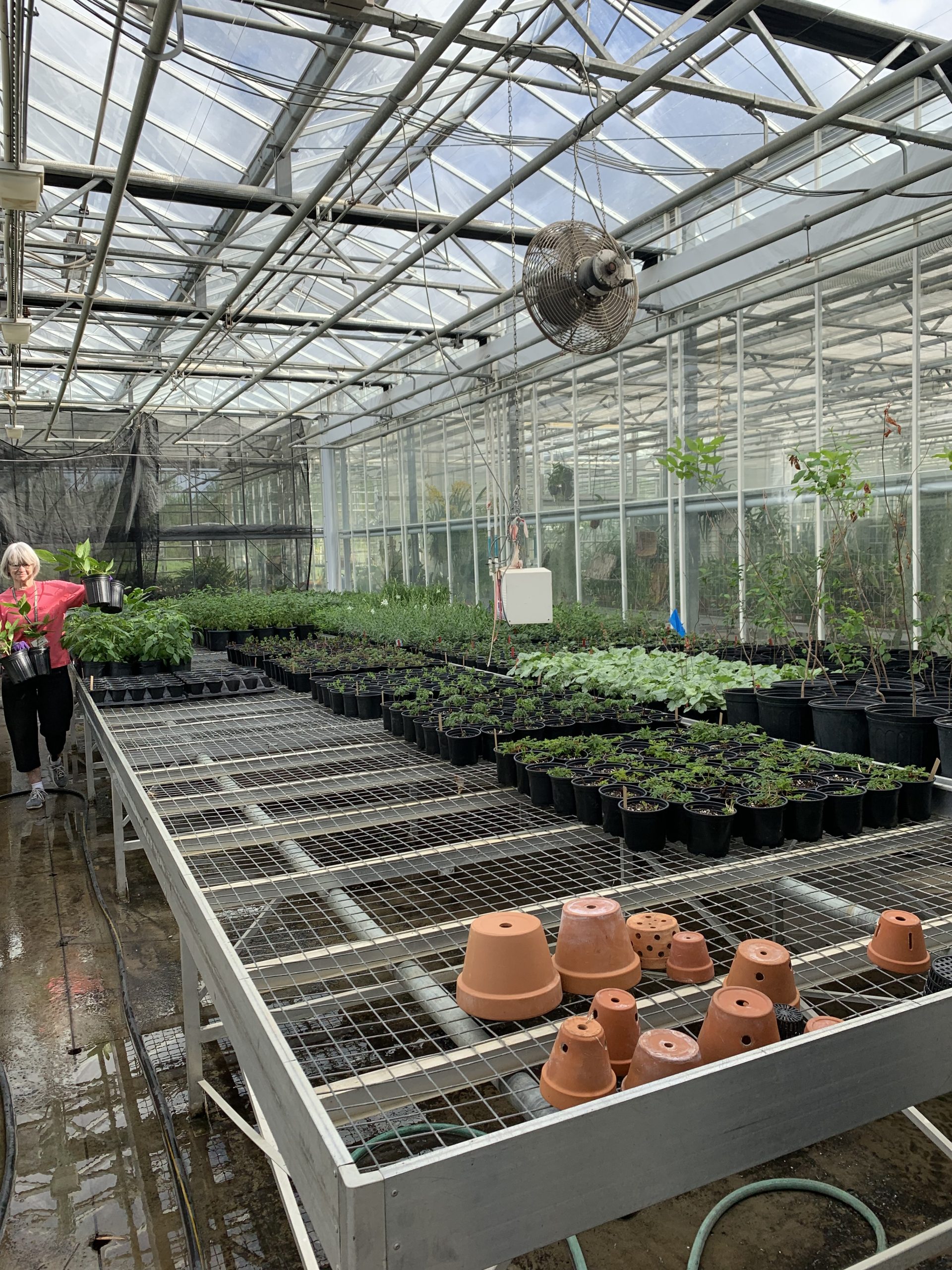 Volunteers are nurturing plants and labeling them in the greenhouse in preparation for the spring plant sale on May 13-14, 2022.