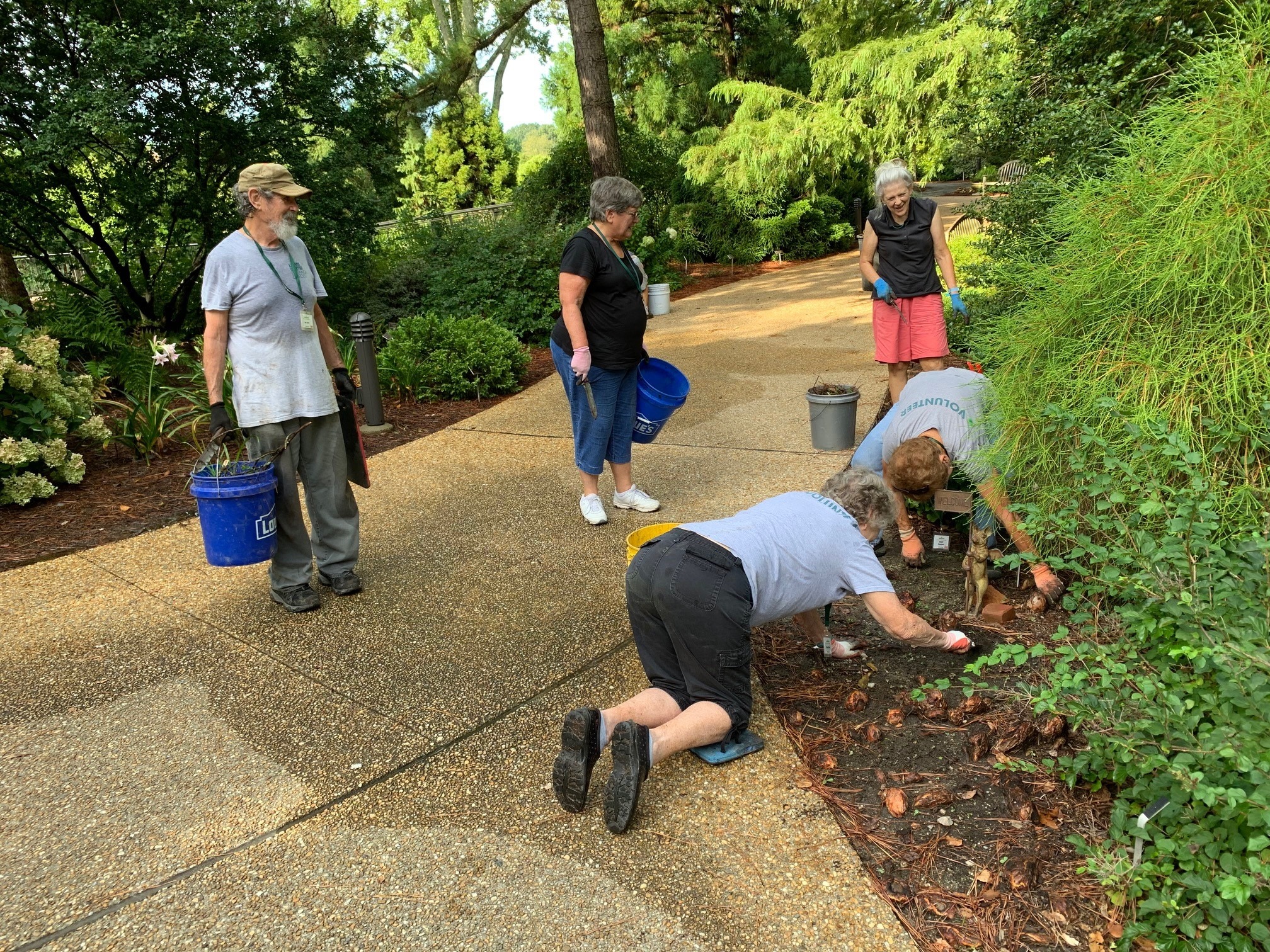 For at least 24 years now, but longer than anyone can remember, teams of six to eight adults have shown up every week on their assigned day, ready to weed, rake, prune, plant, transplant, mulch, fertilize and water. Each team is paired with a particular horticulturist and dedicated to caring for a specific section of the Garden. They prefer to bring their own gloves and hand tools — a favorite pair of pruning shears or an indispensable garden knife. Large tools are delivered to the work site by Garden staff. Many of the volunteers have earned their Master Gardener or Master Naturalist certification. Most of them just love to garden.