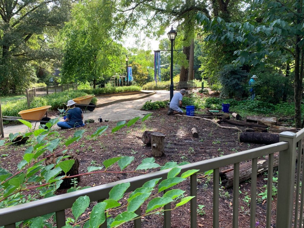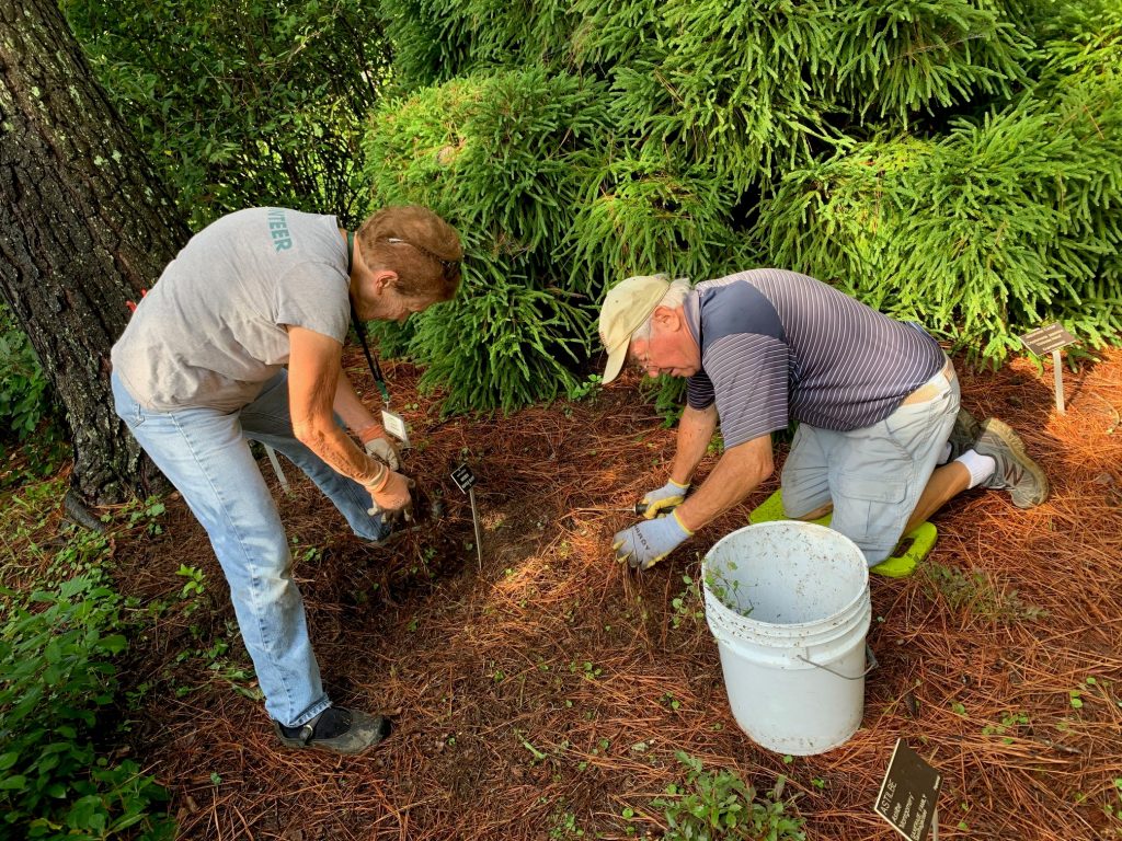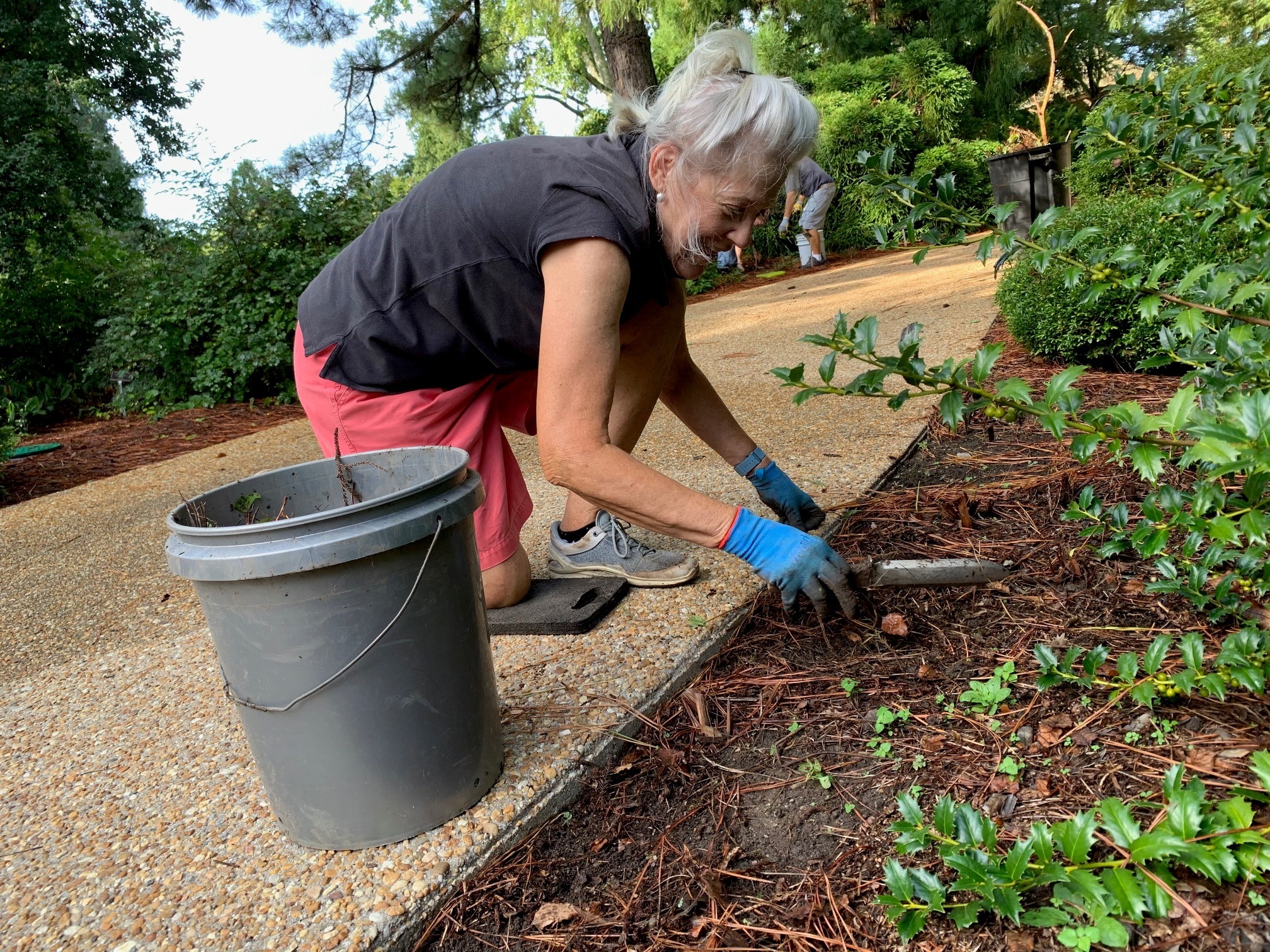 The Garden’s horticulturists love to share their knowledge with the volunteers who work with them. Uprooting English ivy can turn into an exercise in identifying and eradicating invasive species. They have been introduced to new plants, discovered the benefits of companion planting, learned when and how to prune a variety of trees and shrubs, and mastered the correct planting depth for different flowering bulbs. “Today we got a lesson about chiggers,” volunteer (and former Garden staffer) Martha Anne Ellis says, her pants legs tucked into her socks. It’s a fashion risk she’s willing to take to outwit the irritating little insects.