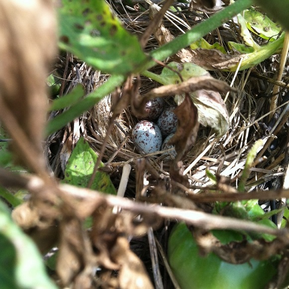 Look what we found in the Community Kitchen Garden tomato plants: A house finch nest!