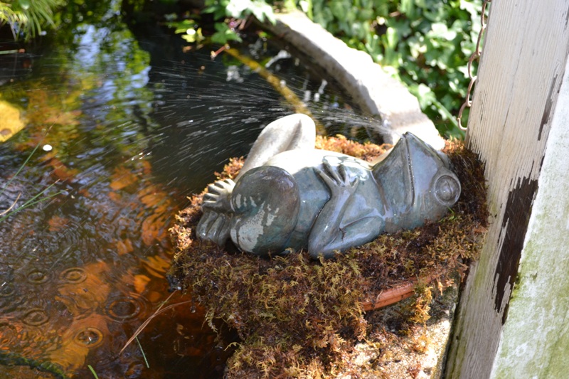 Fearington Village in Pittsboro, N.C. uses decorative frog as fountain in water garden. Photo by Grace Chapman