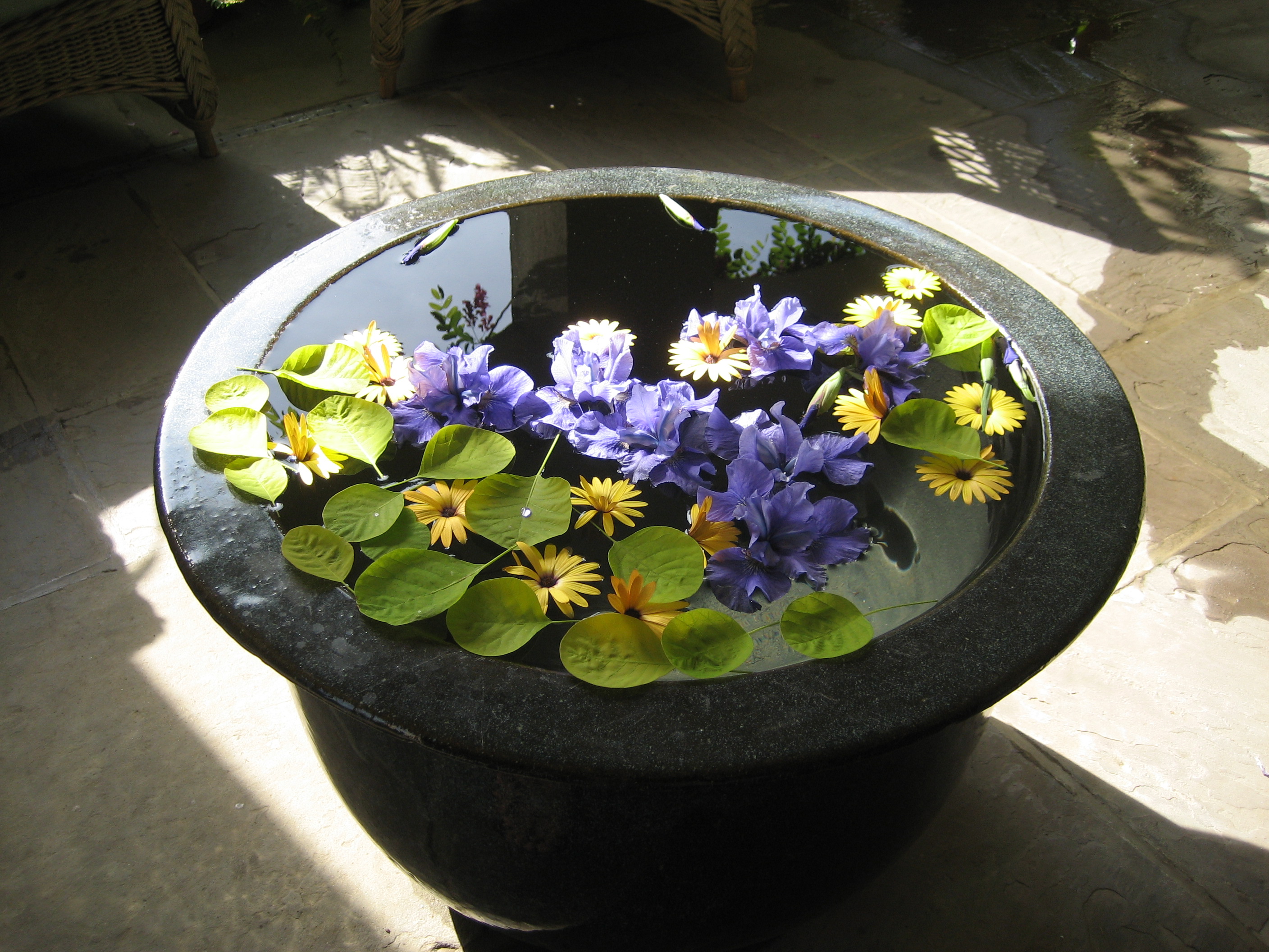Creative expression continues with the display, whether it’s a still water garden or a bubbling fountain. Multiple water pots vertically stacked in ragged progression are eye-catchers, as are themed gardens, like fairy or tropical water gardens complemented with decorative ornaments and collectibles. Containers in unexpected places, such as nestled in an old tree stump, entice passers-by to pause, reflect and enjoy. They’re dramatic additions indoors, too, as table centerpieces, bathroom showpieces, office decoratives and foyer accents.