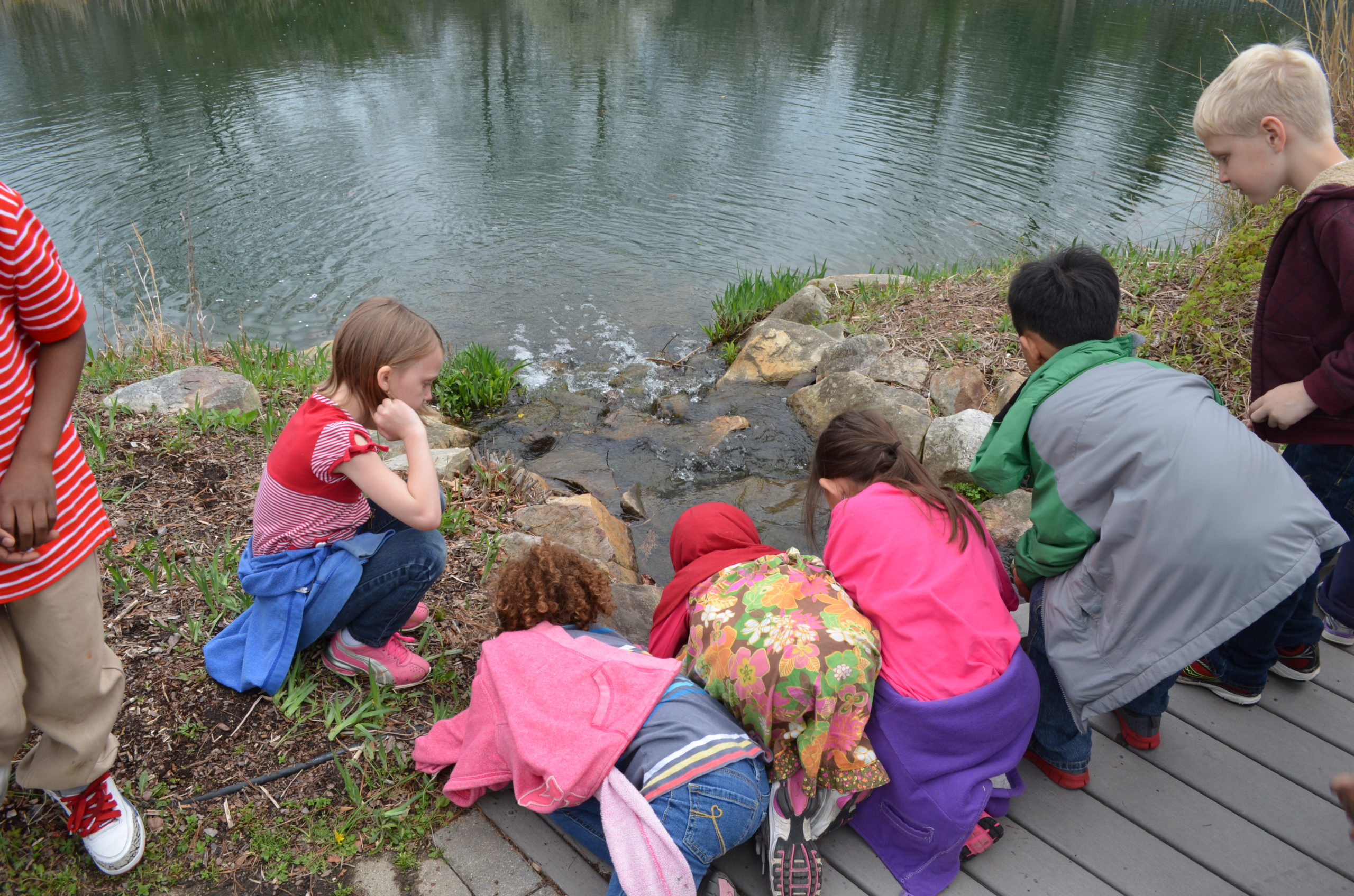 These students are getting a close-up view of how water flows from the stream in the Asian Valley to the West Island wetland.