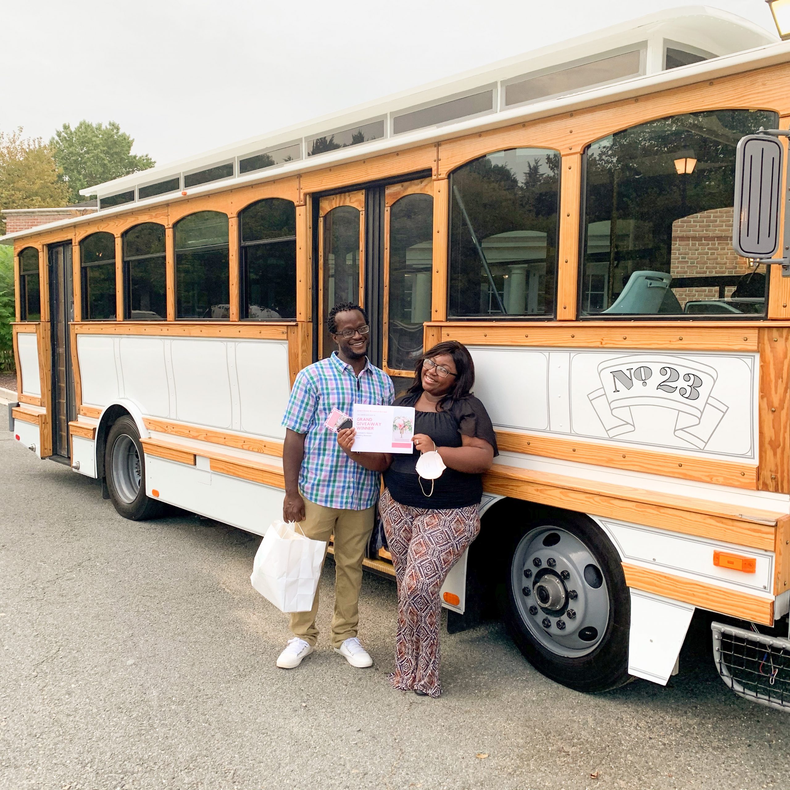 Our Grand Giveaway winner Octavia Perrin and her fiance in front of the RVA on Wheels Trolley.