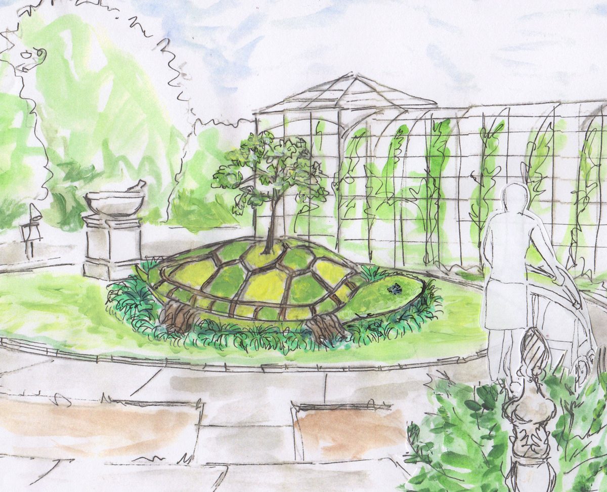 A: The turtle’s shell will be made up of a pleasing array of drought tolerant sedums and ground cover in differing shades of green.