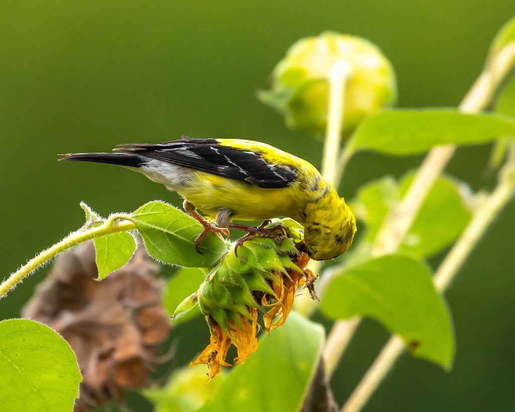 A goldfinch in enjoys seeds from the winter wildscapes. Photo by Tom Hennessy