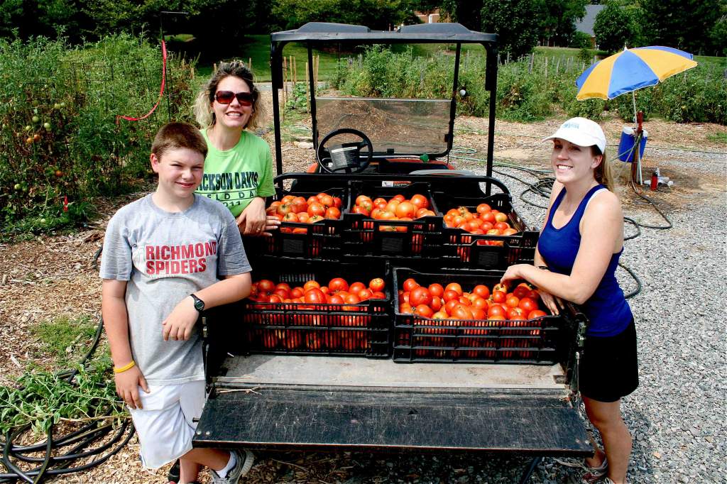 These three volunteers may have set a harvesting record yesterday in the Lewis Ginter Community Kitchen Garden. Within just three hours they collected ten cases of tomatoes and four cases of summer squash. We could go through the math of the retail value of 500 pounds of garden-fresh produce compared to the current price of an ounce of gold, but that really doesn’t begin to measure the true value of these volunteers.
